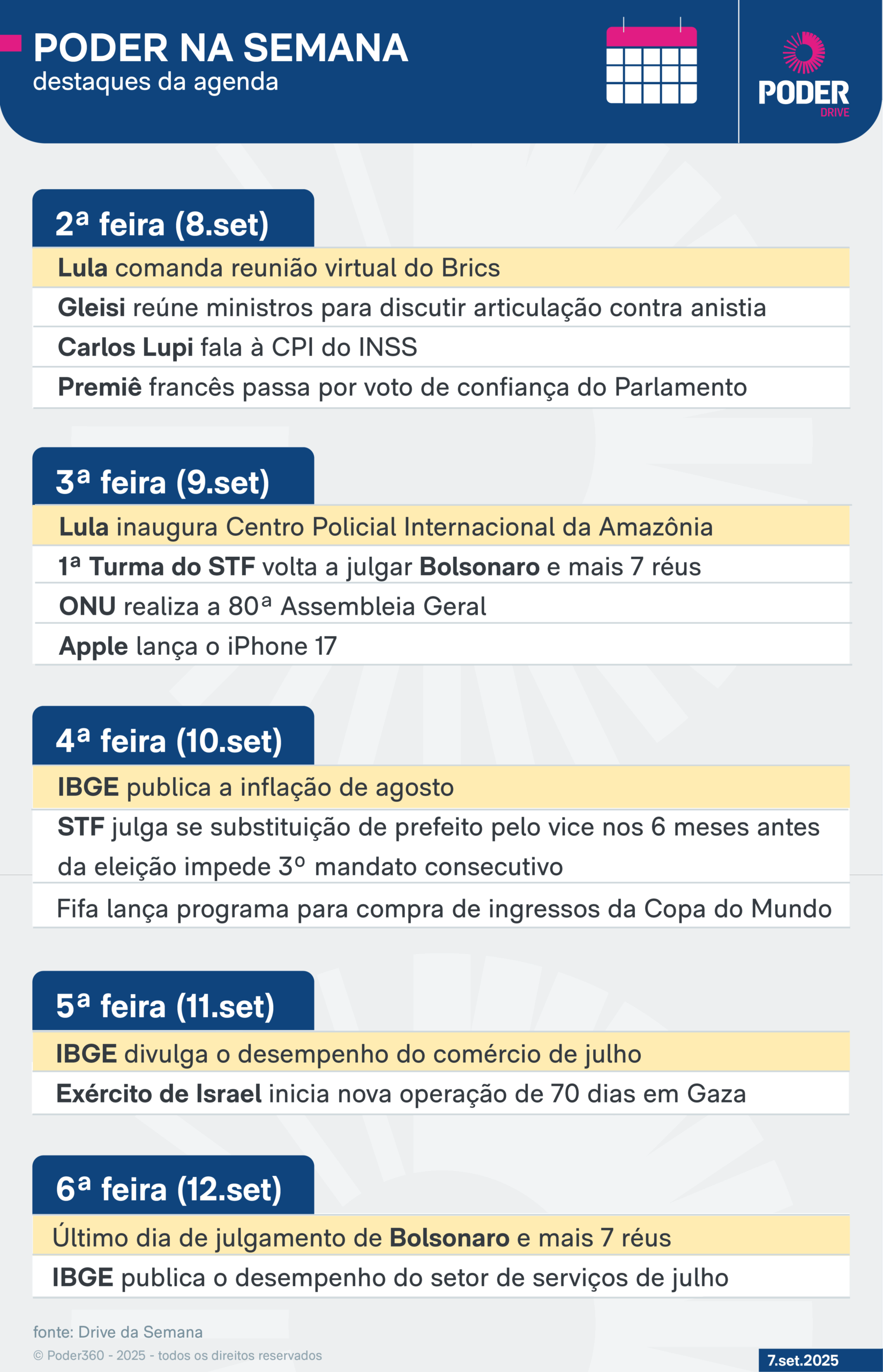 A 1ª Turma do Supremo, composta por 5 dos 11 ministros da Corte, volta a se reunir na 3ª feira (9.set) para dar continuidade ao julgamento de Jair Bolsonaro (PL) e outros 7 réus no processo que analisa a tentativa de golpe de Estado em 2022. Haverá sessões na 4ª, 5ª e 6ª feiras (10 a 12.set).