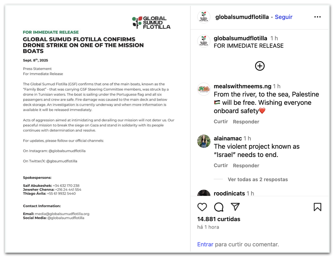 A flotilha é uma iniciativa que busca entregar ajuda humanitária a Gaza por meio de embarcações civis, com apoio de delegações de 44 países. Uma das líderes do movimento é a ativista sueca Greta Thunberg.