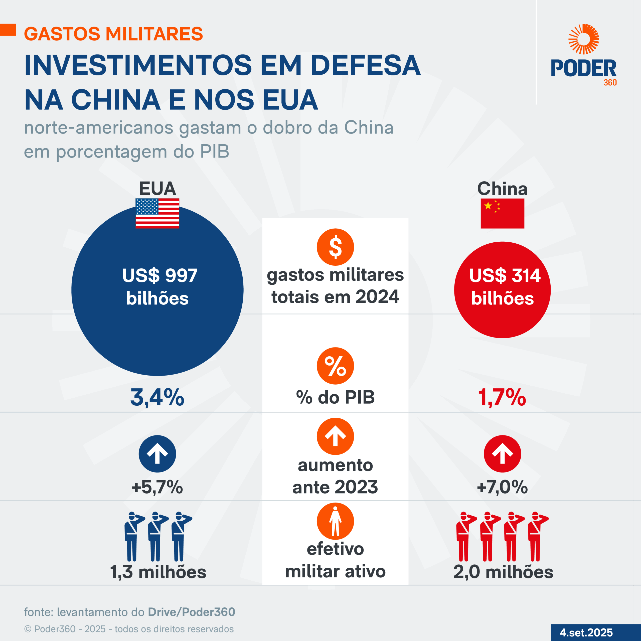 Ele reforça que os norte-americanos ainda representam 37% dos gastos globais com defesa, o que os coloca na 1ª posição mundial nesse aspecto: “Ela [China] aparece na 2ª posição, após os EUA, mas não dispõe dos mesmos recursos militares. Mesmo somando os gastos dos 10 países seguintes, não se aproximam do orçamento militar dos EUA”.