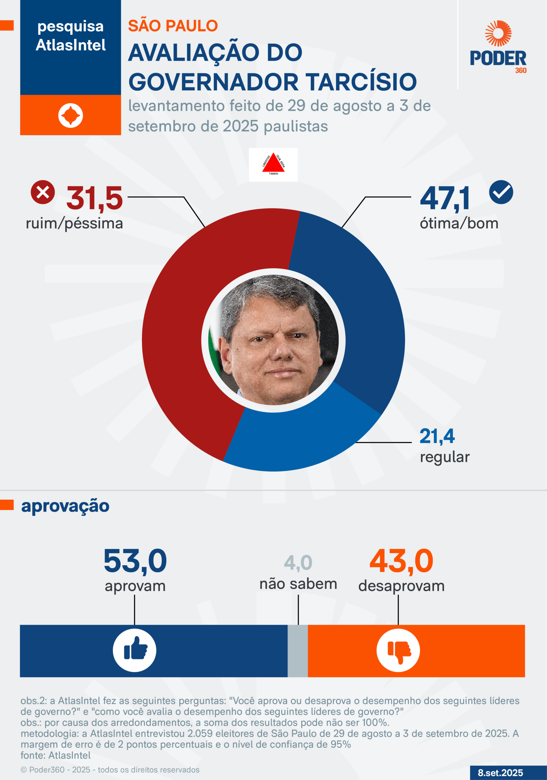 A AtlasIntel entrevistou 2.059 eleitores de São Paulo de 29 de agosto a 3 de setembro de 2025 por meio do recrutamento digital aleatório (Atlas RDR). A margem de erro é de 2 p.p., para mais ou para menos. O nível de confiança é de 95%.