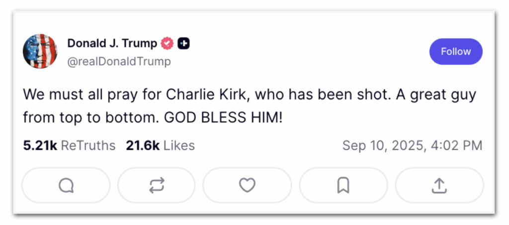 Em seus perfis nas redes sociais, Trump pediu orações pelo aliado: “Devemos todos rezar por Charlie Kirk, que foi baleado. Um cara incrível, do começo ao fim. QUE DEUS O ABENÇOE!”.