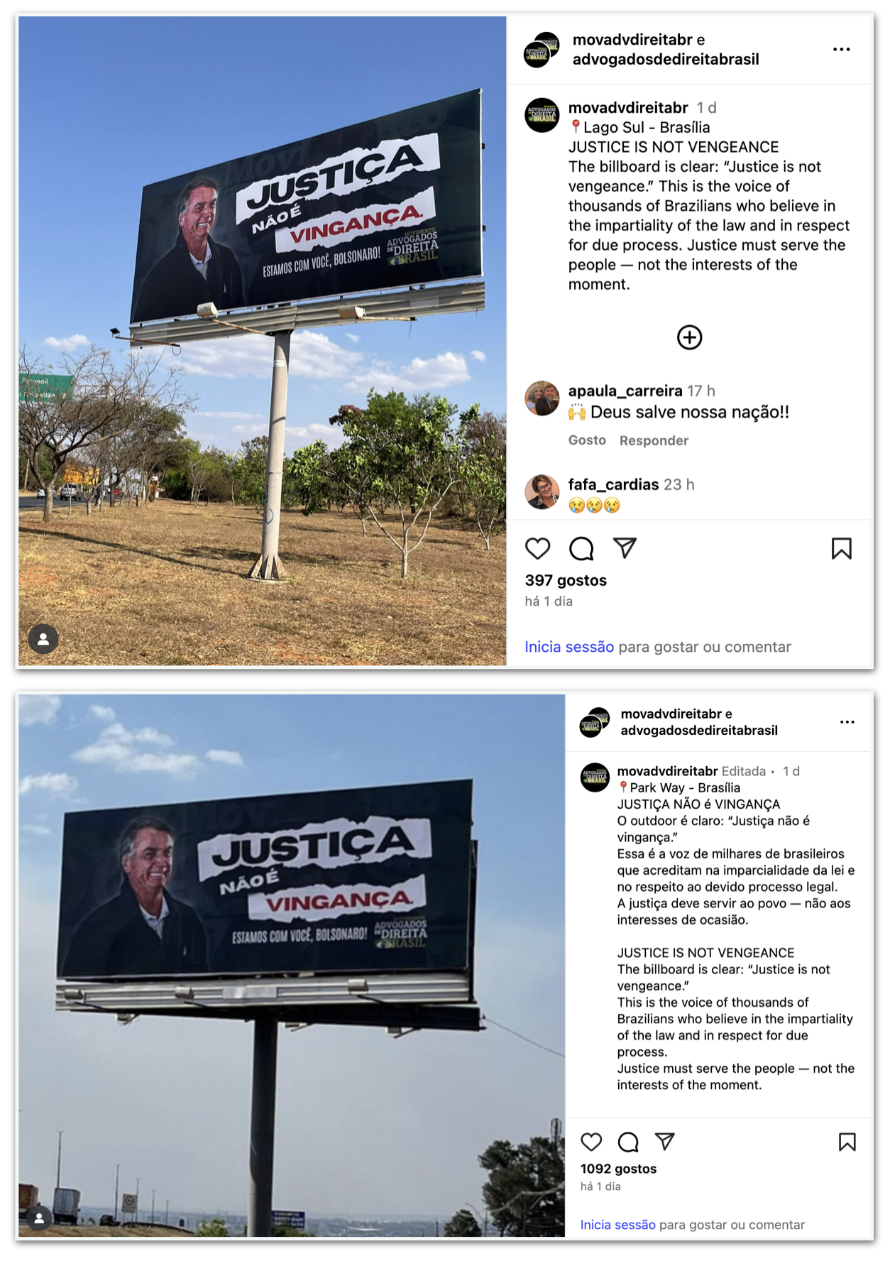 O perfil do grupo no Instagram publicou imagens dos outdoors no Lago Sul e na Park Way, na capital federal. Há uma foto do ex-presidente e a seguinte mensagem: “Justiça não é vingança. Estamos com você, Bolsonaro”.