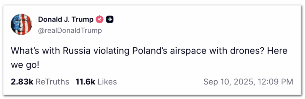O presidente dos Estados Unidos, Donald Trump (Partido Republicano), publicou nesta 4ª feira (10.set.2025) um post curto em sua rede social comentando a violação do espaço aéreo polonês por drones russos. O texto não deixa claro se o líder norte-americano estava ironizando a ação russa ou acionando ajuda militar.