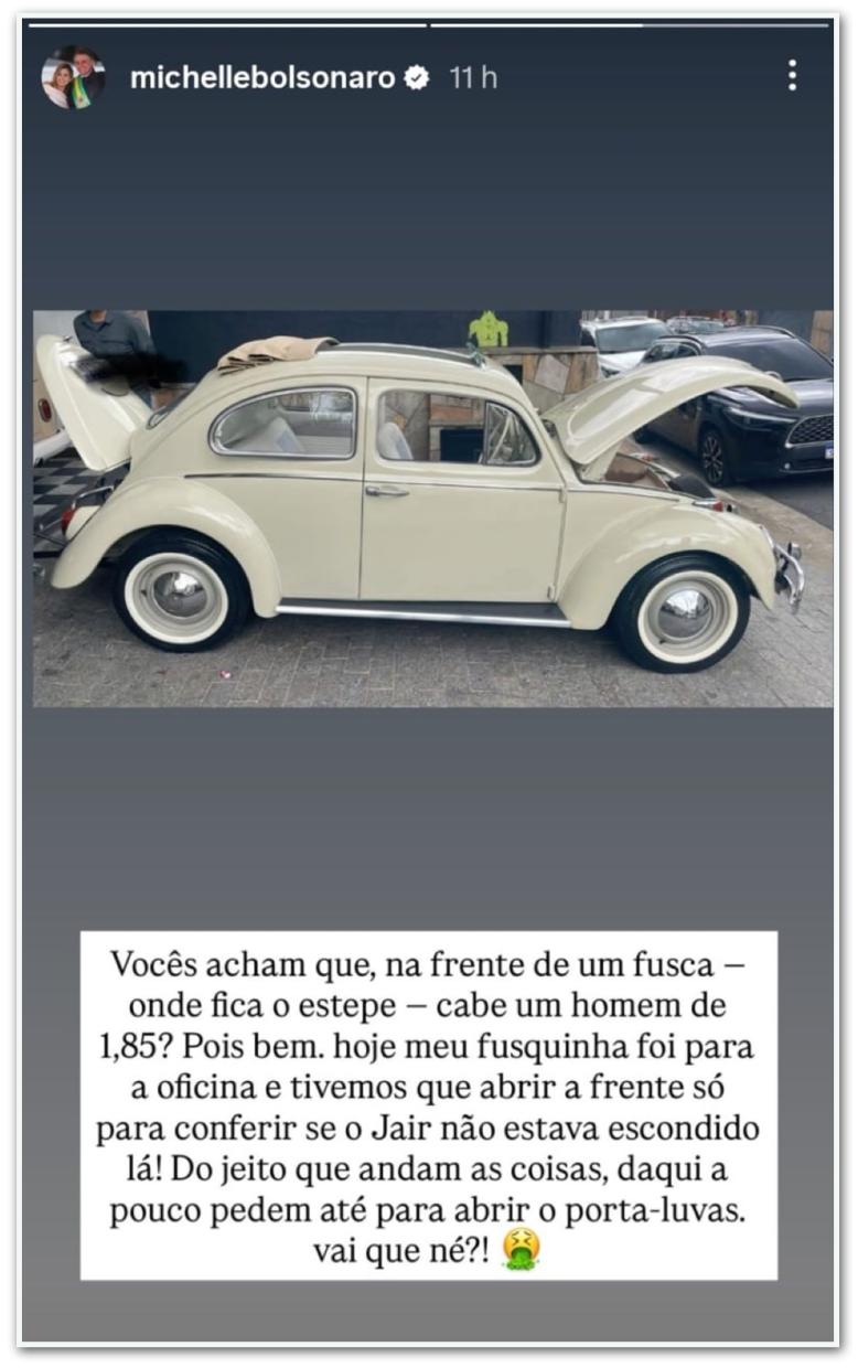 “Vocês acham que, na frente de um fusca –onde fica o estepe– cabe um homem de 1,85 [metros]? Pois bem. Hoje meu fusquinha foi para a oficina e tivemos que abrir a frente só para conferir se o Jair não estava escondido lá! Do jeito que andam as coisas, daqui a pouco pedem até para abrir o porta-luvas. Vai que né?!”, escreveu Michelle.