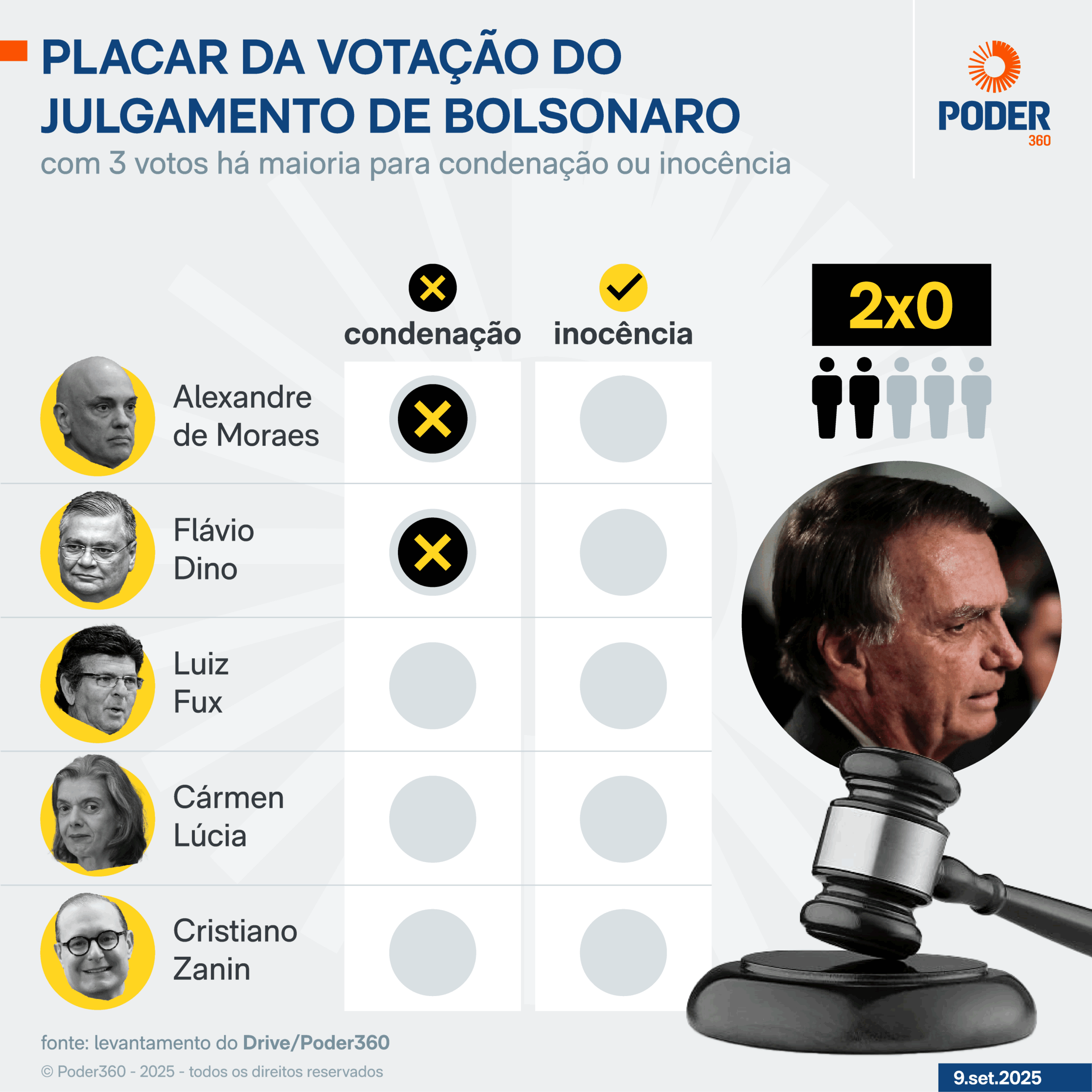 A 1ª Turma do STF julga o ex-presidente Jair Bolsonaro (PL) e mais 7 réus por tentativa de golpe de Estado. O Supremo já ouviu as sustentações orais das defesas de todos os réus. Agora, serão os ministros a votar. Na 3ª feira (9.set), o ministro Flávio Dino acompanhou o ministro Alexandre de Moraes e votou pela condenação de Bolsonaro.