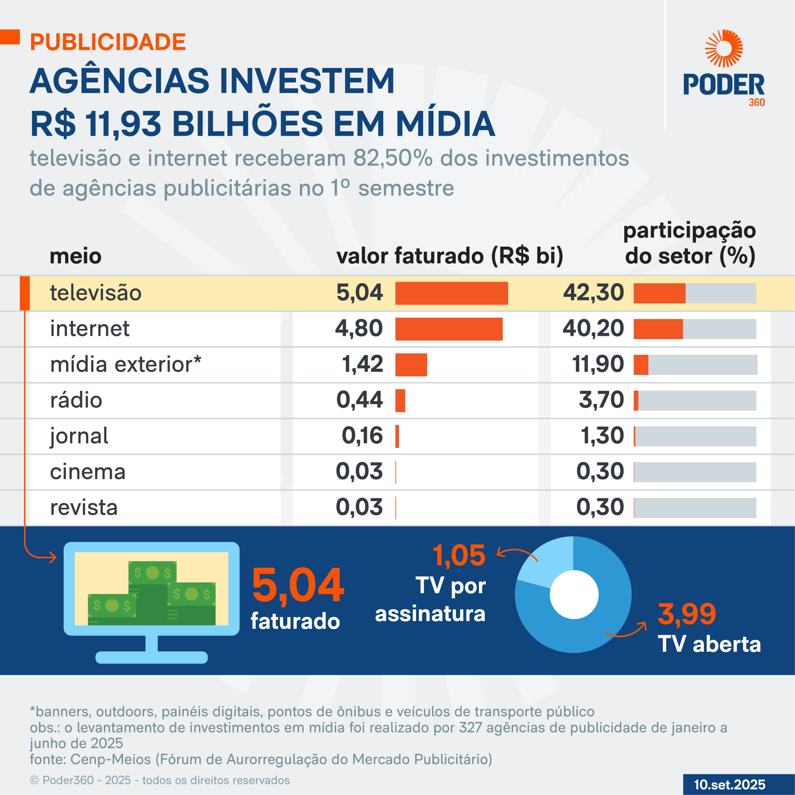A televisão se manteve como o meio de comunicação que mais recebeu investimentos. Foram R$ 5,04 bilhões, divididos em R$ 3,99 bilhões para TV aberta e R$ 1,05 bilhão para TV por assinatura. O montante destinado às emissoras cresceu 6% na comparação com os R$ 4,75 bilhões dos primeiros 6 meses de 2024.