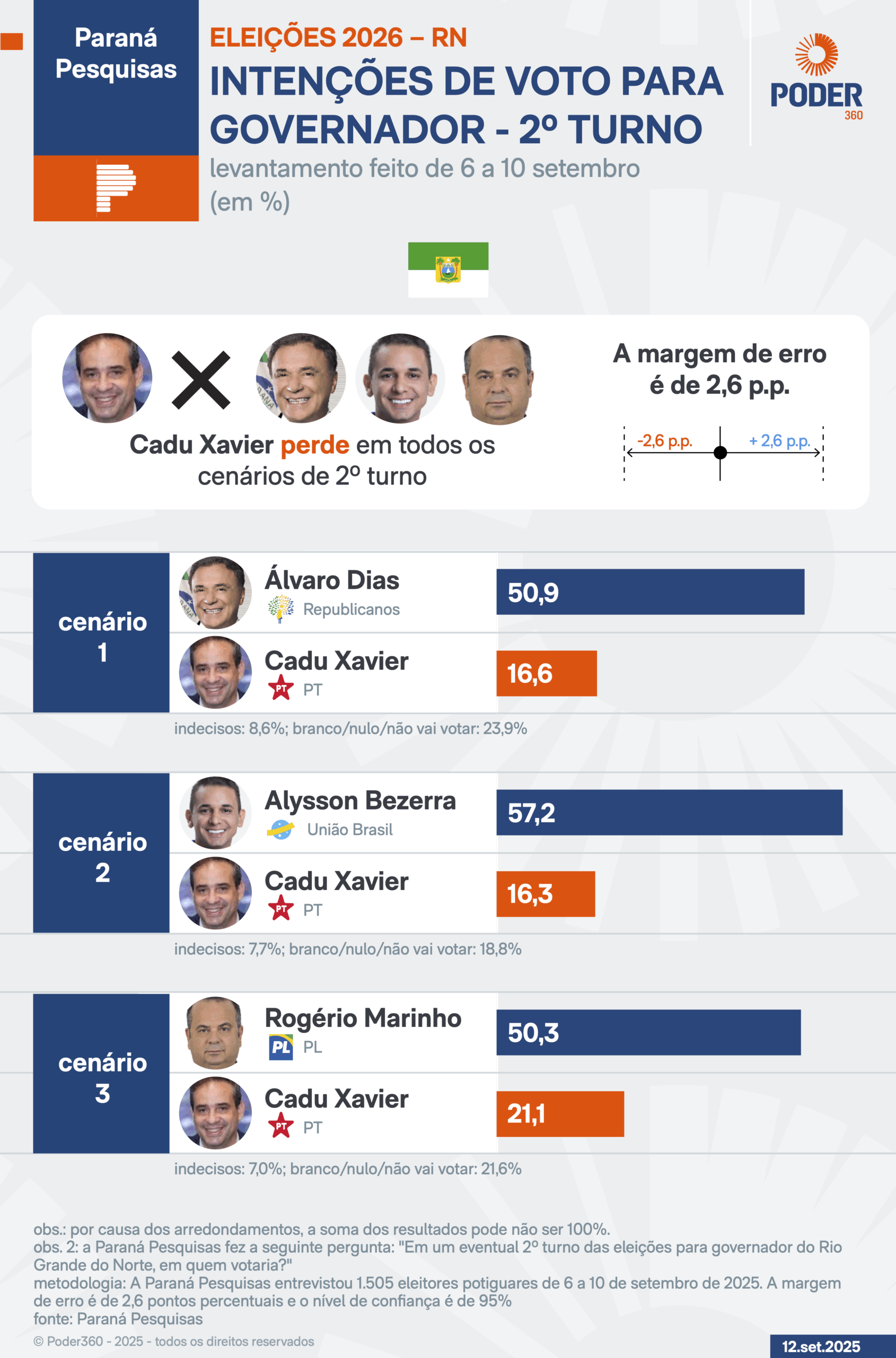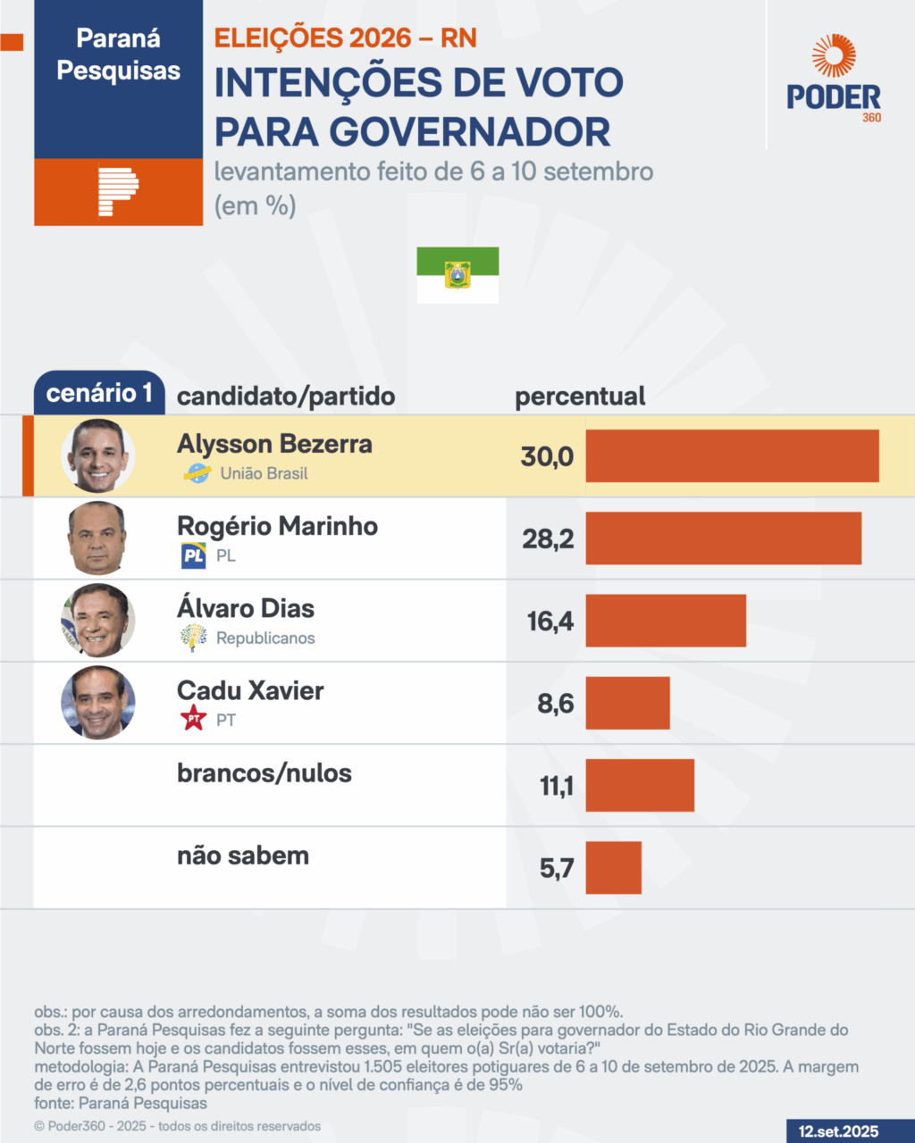 A Paraná Pesquisas entrevistou 1.505 eleitores potiguares de 6 a 10 de setembro de 2025. A margem de erro é de 2,6 pontos percentuais e o nível de confiança é de 95%.