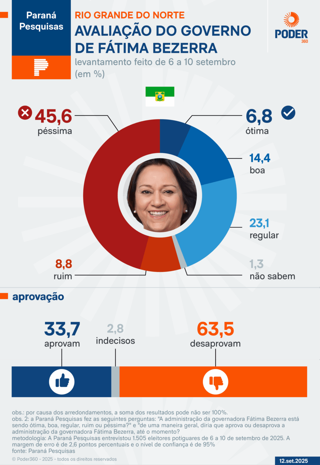 A Paraná Pesquisas entrevistou 1.505 eleitores potiguares de 6 a 10 de setembro de 2025. A margem de erro é de 2,6 pontos percentuais e o nível de confiança é de 95%.