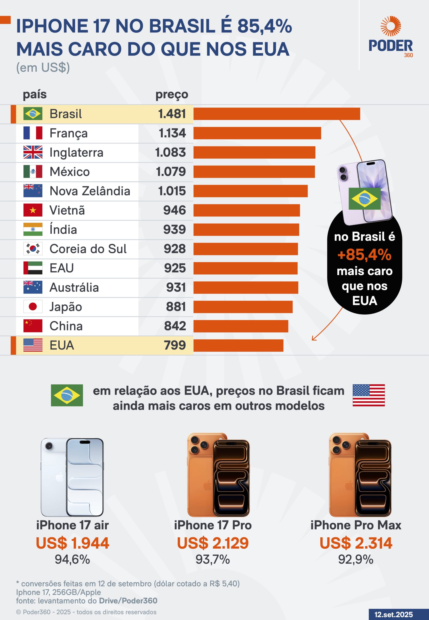 O levantamento do Drive/Poder360 considerou preços divulgados no site oficial da Apple Store em 13 países e utilizou a cotação do dólar a R$ 5,40, em 12 de setembro de 2025.