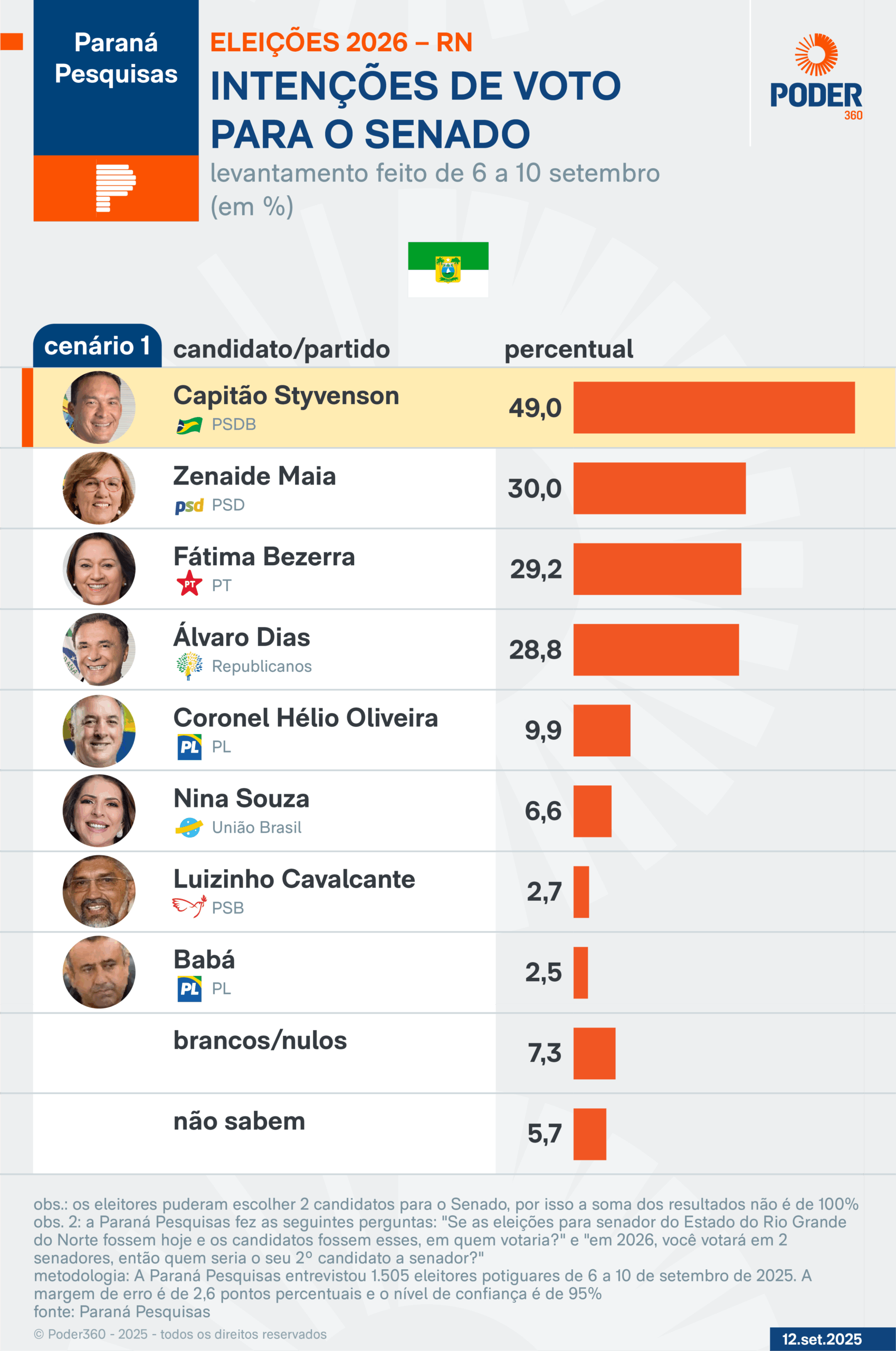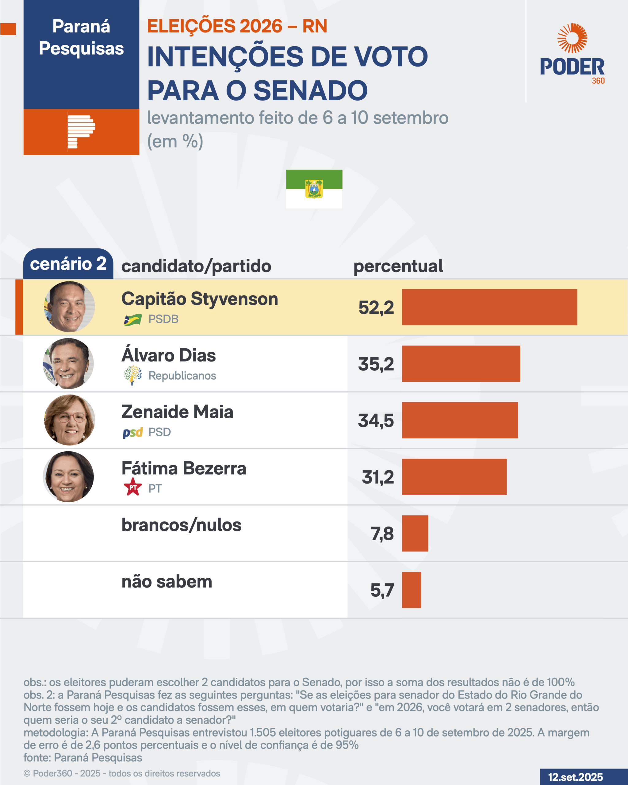 A Paraná Pesquisas entrevistou 1.505 eleitores potiguares de 6 a 10 de setembro de 2025. A margem de erro é de 2,6 pontos percentuais e o nível de confiança é de 95%.