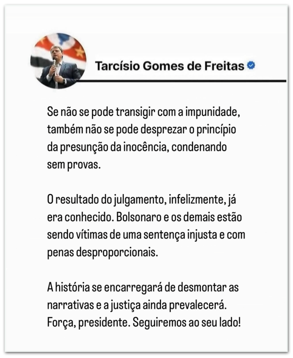 “Se não se pode transigir com a impunidade, também não se pode desprezar o princípio da presunção da inocência, condenando sem provas. O resultado do julgamento, infelizmente, já era conhecido. Bolsonaro e os demais estão sendo vítimas de uma sentença injusta e com penas desproporcionais”, escreveu Tarcísio.