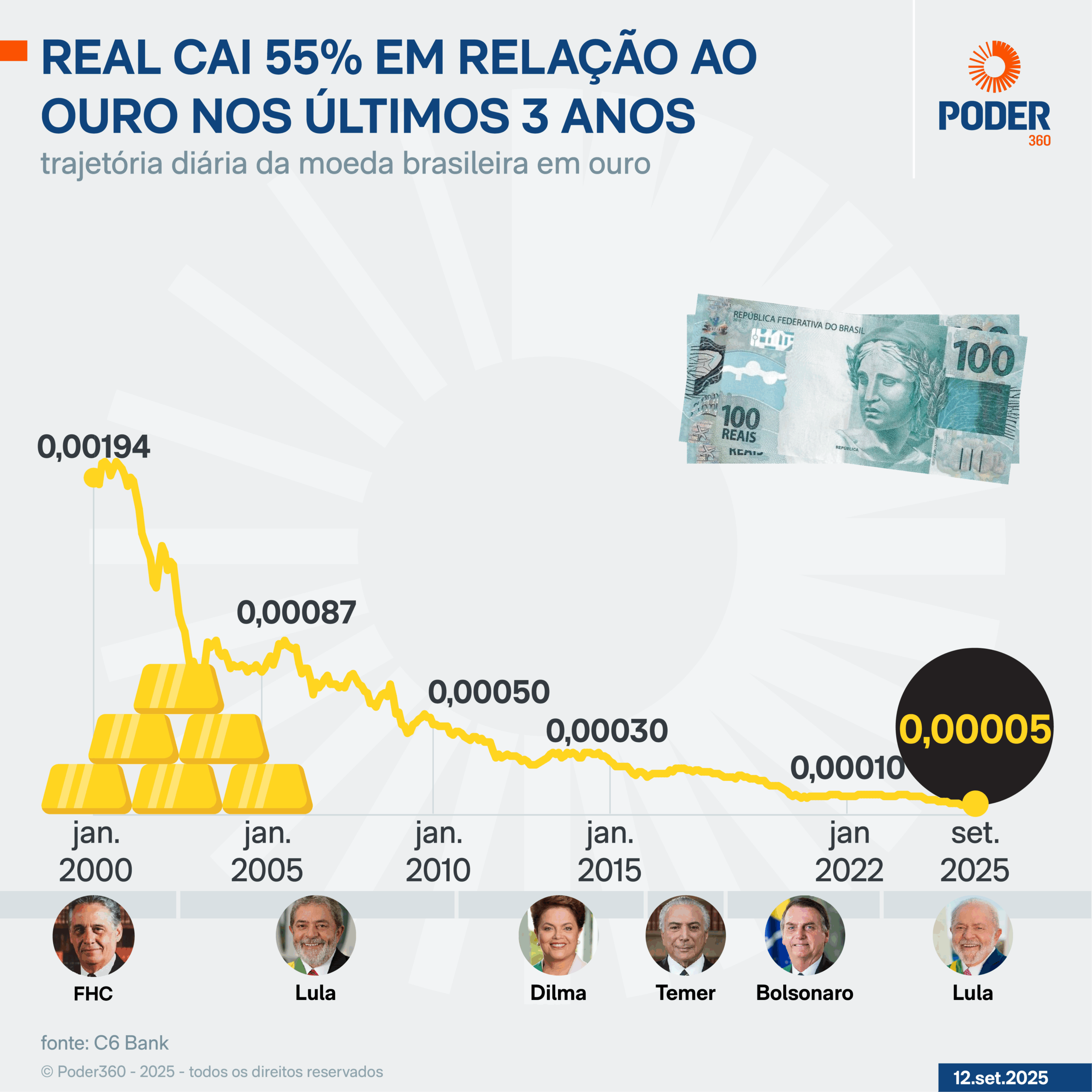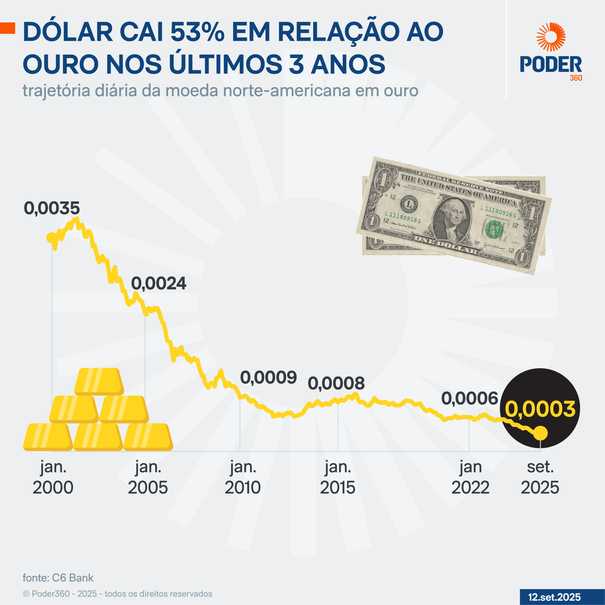 A cotação do dólar subiu 120% nos últimos 3 anos, ao considerar a última cotação de setembro de 2022. Em 2025, a alta foi de 39%.