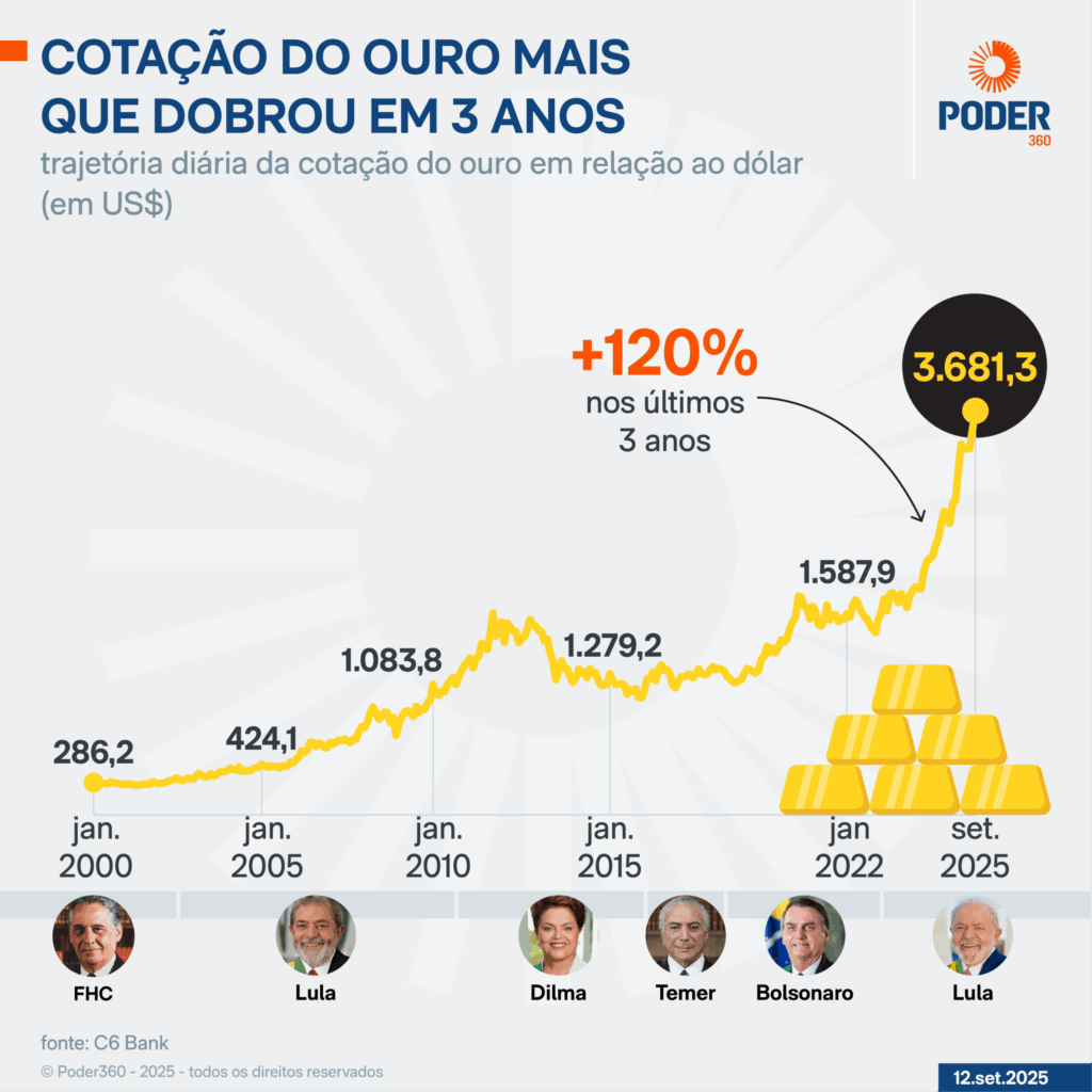 Em geral, quando há incerteza econômica ou queda do dólar, o ouro tende a se valorizar. A cotação passou de US$ 3.000 pela 1ª vez na história em março e de US$ 3.500 em abril. Segue em trajetória de alta.