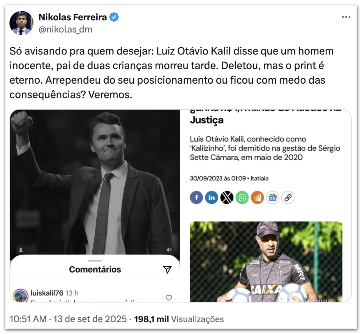Nikolas compartilhou um print do comentário de Luís Otávio Kalil. “Esse fascistinha só pregava ódio, racismo, preconceito, apoiava o genocídio em Gaza. Menos um genocida fascista, já vai é tarde”, escreveu o sobrinho do ex-prefeito em um post sobre Kirk.