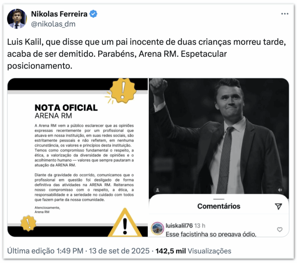 Nikolas compartilhou um print do comentário de Luís Otávio Kalil. “Esse fascistinha só pregava ódio, racismo, preconceito, apoiava o genocídio em Gaza. Menos um genocida fascista, já vai é tarde”, escreveu o sobrinho do ex-prefeito em um post sobre Kirk.