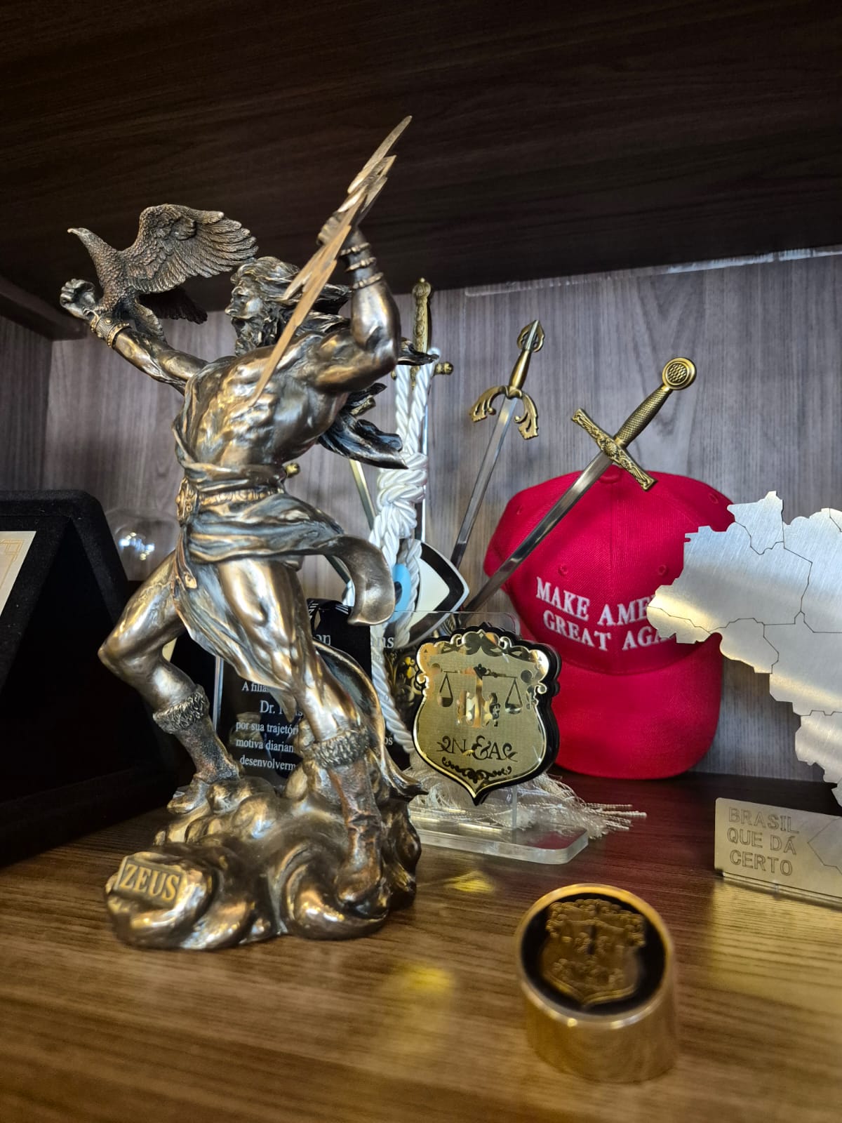 Entre as apreensões da PF estava uma estátua de bronze representando o deus mitológico Zeus; atrás, vê-se um boné do movimento “Make America Great Again”, de apoio a Donald Trump