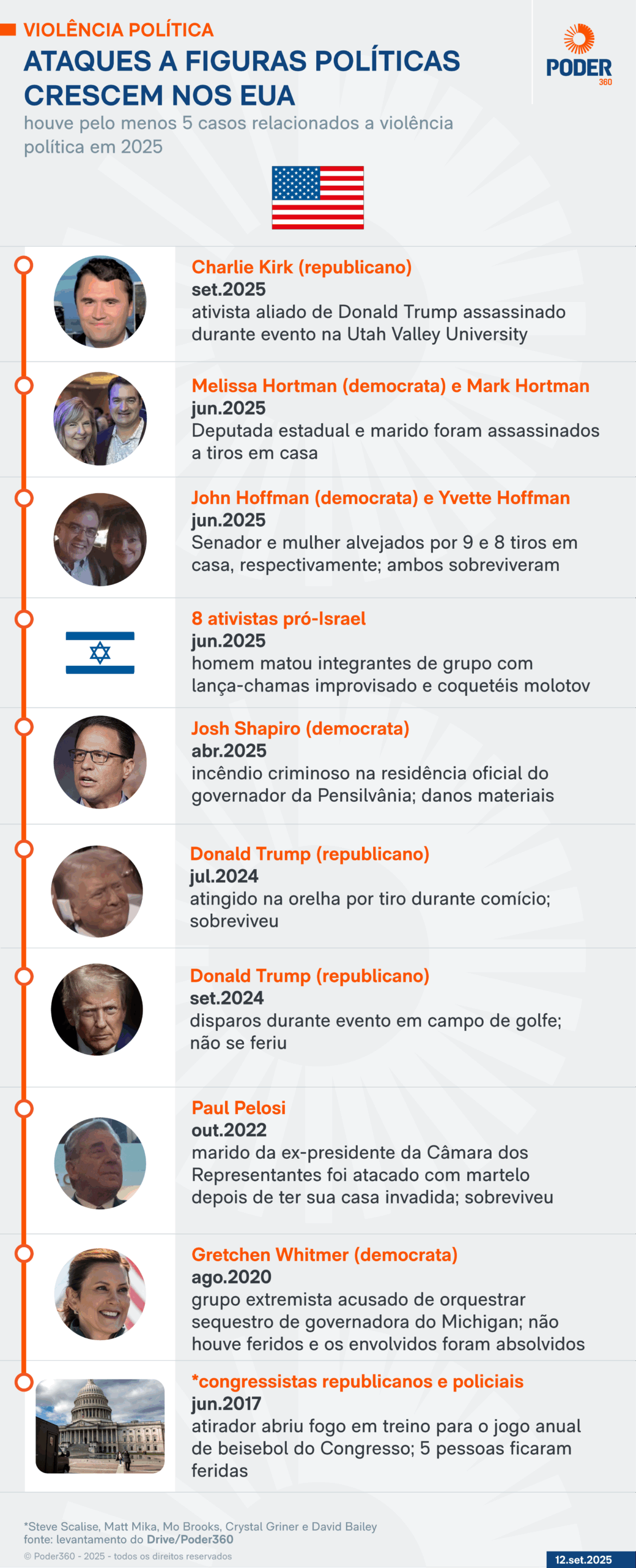 O Poder360 levantou que, desde 2017, ao menos 10 casos de violência política afetaram figuras democratas e republicanas.