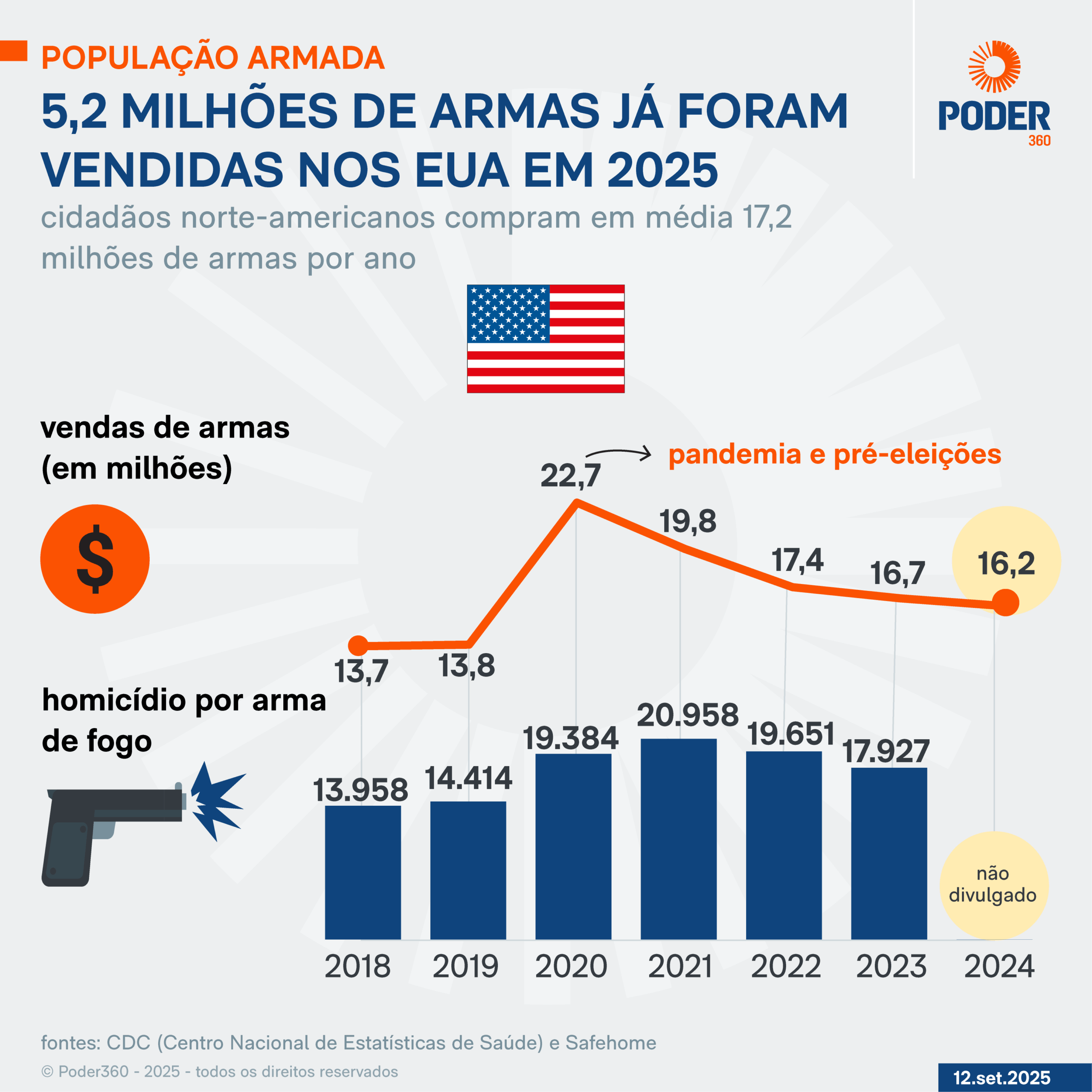 Como detalha a SafeHome, as vendas de armas nos EUA diminuíram anualmente. Em 2024, foram vendidas 16,2 milhões, redução de 28,6% em relação a 2020. Nos primeiros 4 meses de 2025, foram vendidas cerca de 5,2 milhões de armas.