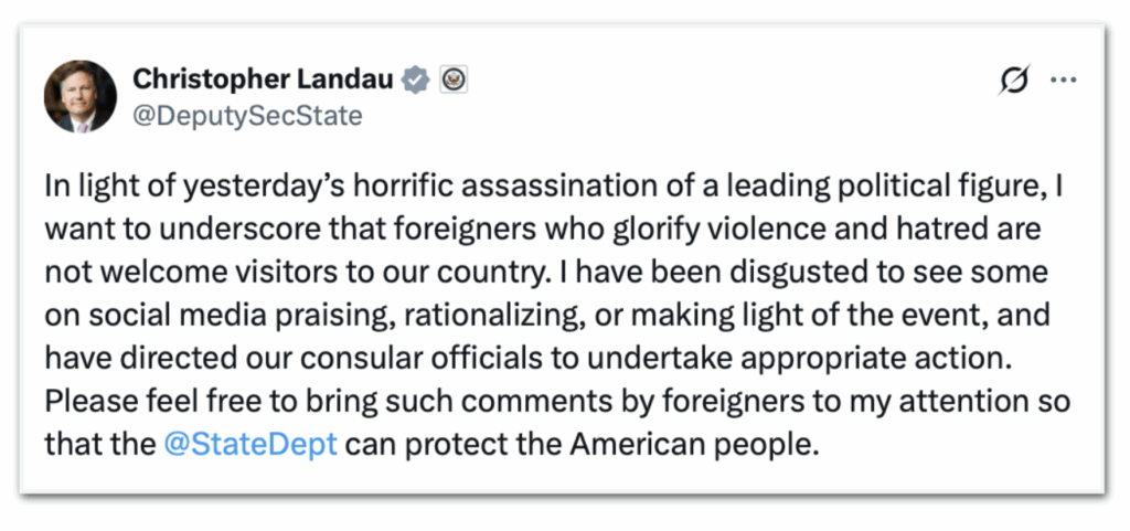 No dia seguinte ao assassinato de Kirk, Landau publicou uma mensagem no X pedindo aos seus seguidores que encaminhassem a ele comentários feitos por estrangeiros.