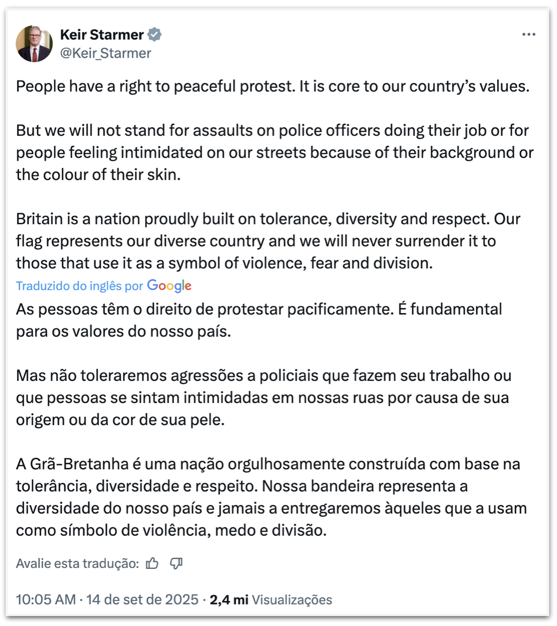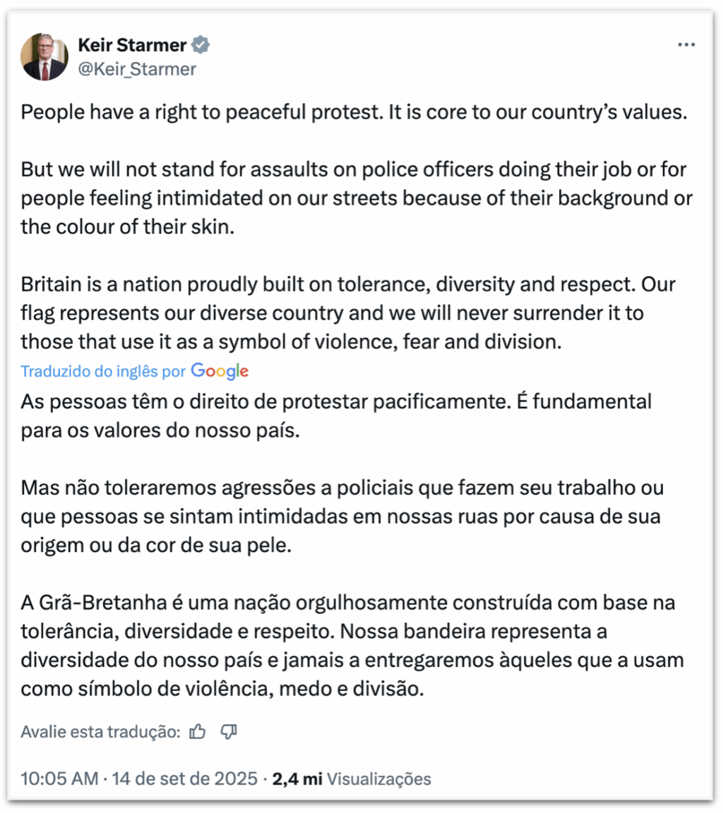 “As pessoas têm o direito de protestar pacificamente. É fundamental para os valores do nosso país. Mas não toleraremos agressões a policiais que estão cumprindo seu dever, nem que as pessoas se sintam intimidadas nas ruas por causa de sua origem ou cor da pele”, declarou Starmer.