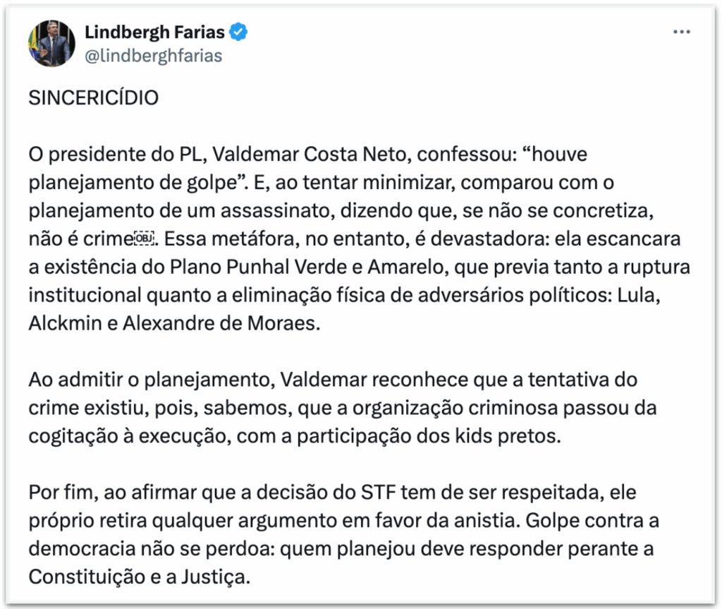 O líder do PT na Câmara, Lindbergh Farias (RJ), rebateu às declarações de Valdemar. Segundo ele, a fala “escancara a existência do Plano Punhal Verde e Amarelo, que previa tanto a ruptura institucional quanto a eliminação física de adversários políticos: Lula, Alckmin e Alexandre de Moraes”.