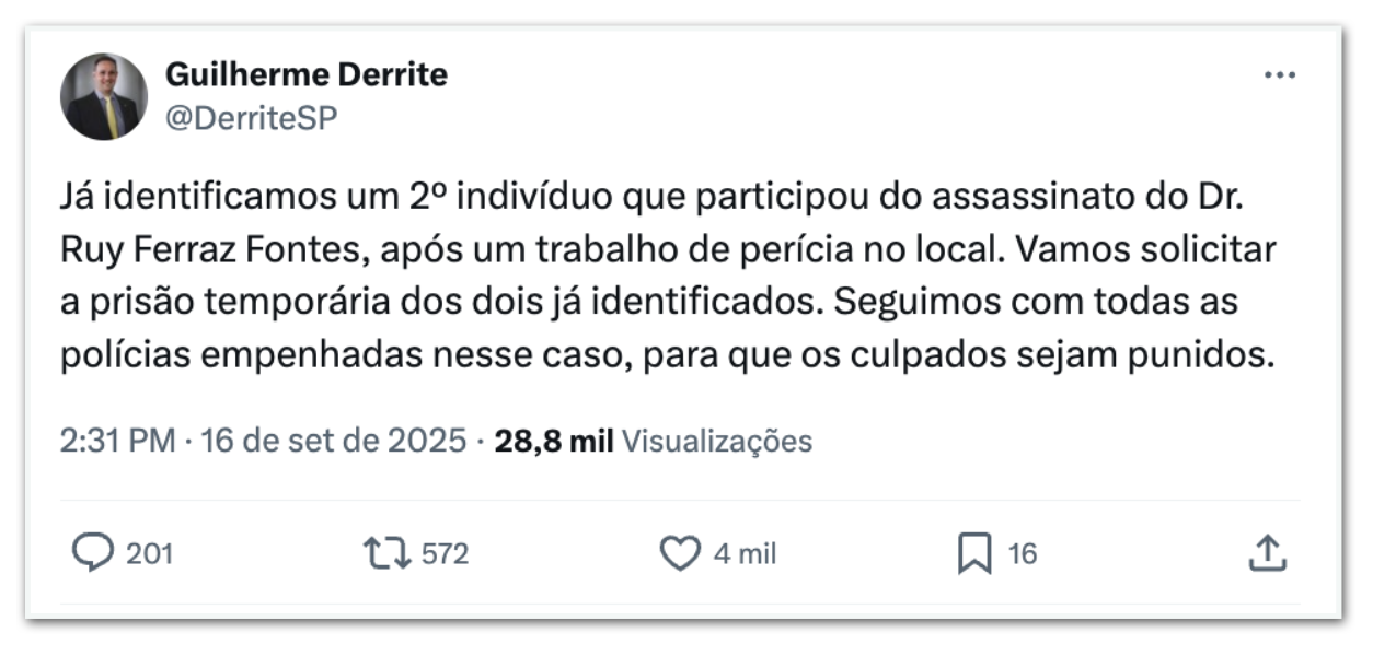 “Um carro foi encontrado abandonado, os criminosos não conseguiram atear fogo. No interior deste veículo, a polícia conseguiu coletar material para identificação. A polícia civil já está requisitando a prisão desse criminoso”, declarou Derrite a jornalistas durante o velório do ex-delegado, nesta 3ª feira (16.set), na Alesp (Assembleia Legislativa do Estado de São Paulo).