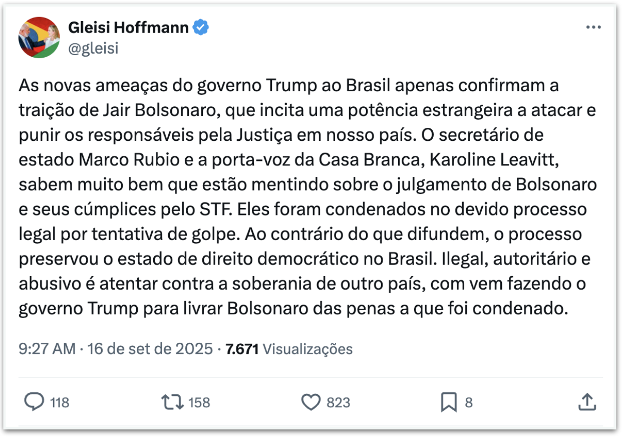Em uma publicação feita no X nesta 3ª feira (16.set.2025), Gleisi criticou o secretário de Estado dos Estados Unidos, Marco Rubio, e a porta-voz da Casa Branca, Karoline Leavitt. Na 2ª feira (15.set), Rubio disse que pretende anunciar na próxima semana sanções adicionais ao Brasil depois da condenação de Bolsonaro pelo STF (Supremo Tribunal Federal) por tentativa de golpe de Estado.