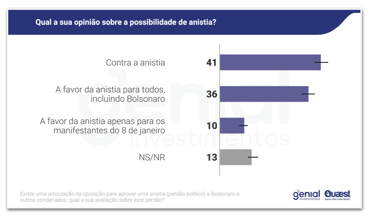 Já 36% são favoráveis a uma anistia para todos, incluindo Bolsonaro, enquanto 10% concordam com perdão limitado aos manifestantes que invadiram as sedes dos Três Poderes em Brasília em janeiro de 2023. Outros 13% dos entrevistados disseram não saber ou não responderam. Eis a íntegra da pesquisa (PDF – 2,3 MB).