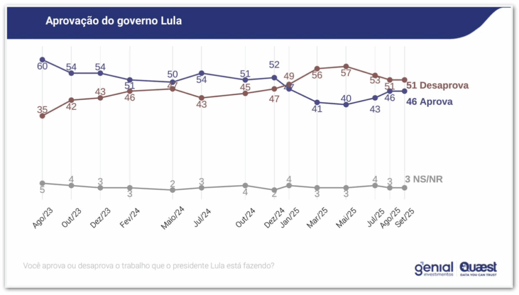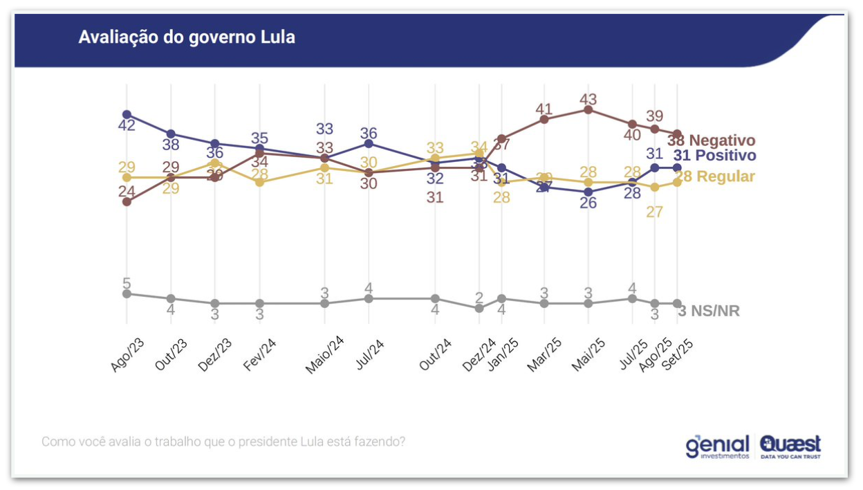 A Quaest ouviu 2.004 pessoas de 12 a 14 de setembro. O nível de confiabilidade da pesquisa é de 95% e a margem de erro é de 2 pontos percentuais para mais ou para menos. A pesquisa foi encomendada pela Genial Investimentos.