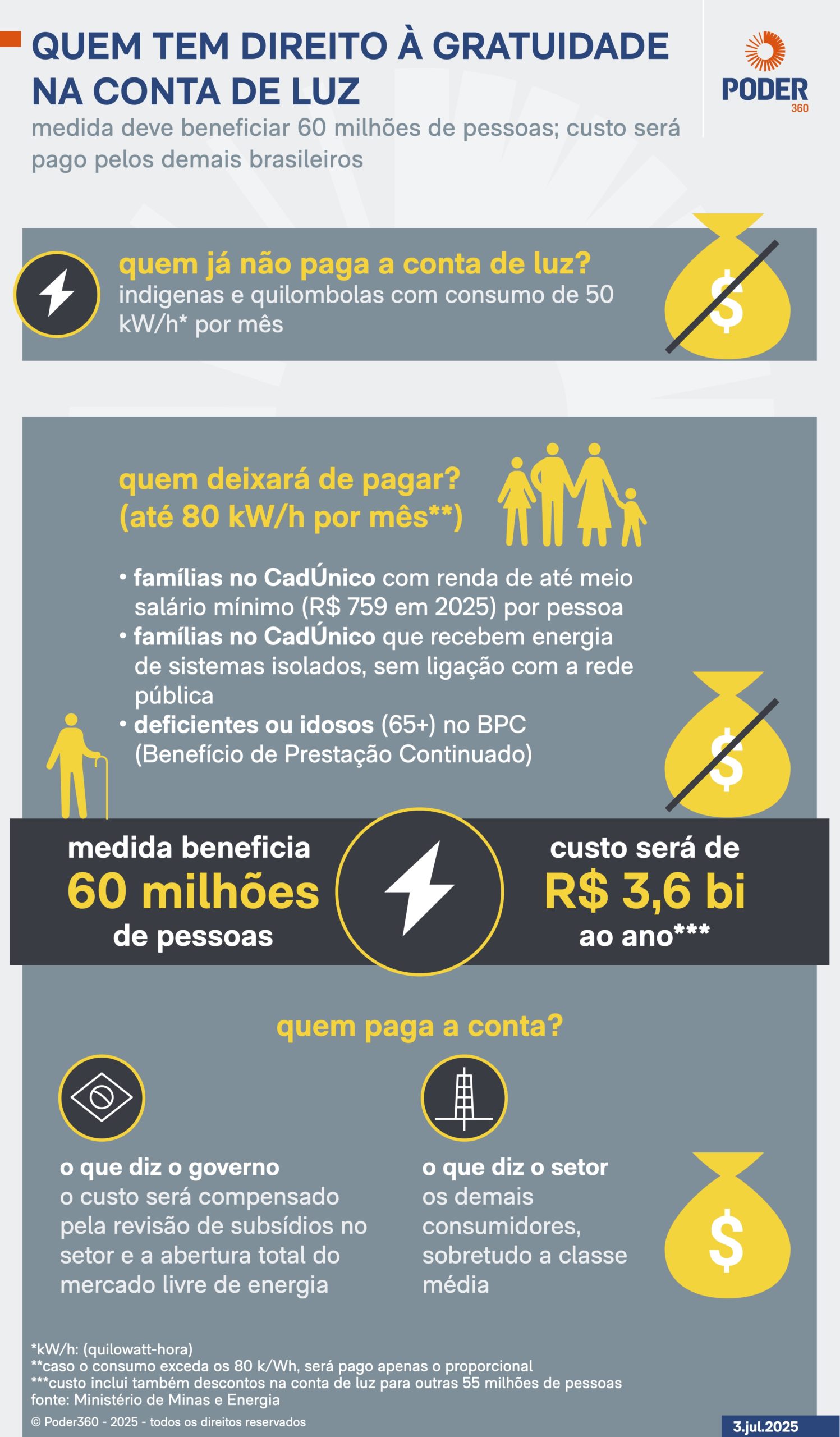 O Senado aprovou nesta 4ª feira (17.set.2025) a medida provisória 1.300 de 2025, que assegura a gratuidade no consumo de até 80 kWh (quilowatt-hora) por mês na conta de luz de famílias pobres. Segundo estimativas do governo do presidente Luiz Inácio Lula da Silva (PT), até 60 milhões de brasileiros serão beneficiados. O custo anual é estimado em R$ 3,6 bilhões por ano.