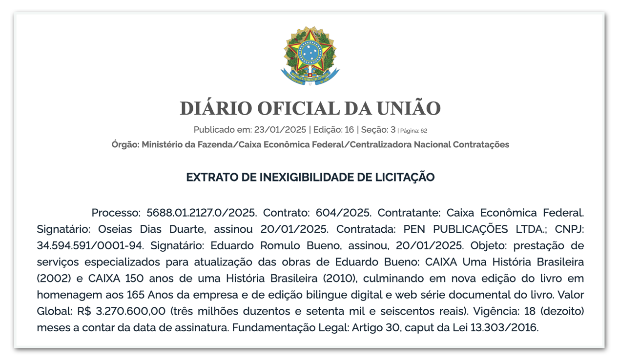 “A CAIXA informa que o jornalista Eduardo Bueno é autor de dois livros sobre a história da CAIXA, contratados em 2002 e 2010.