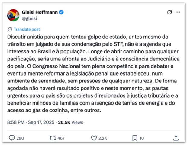 “Discutir anistia para quem tentou golpe de estado, antes mesmo do trânsito em julgado de sua condenação pelo STF, não é a agenda que interessa ao Brasil e à população. Longe de abrir caminho para qualquer pacificação, seria uma afronta ao Judiciário e à consciência democrática do país”, escreveu no X.
