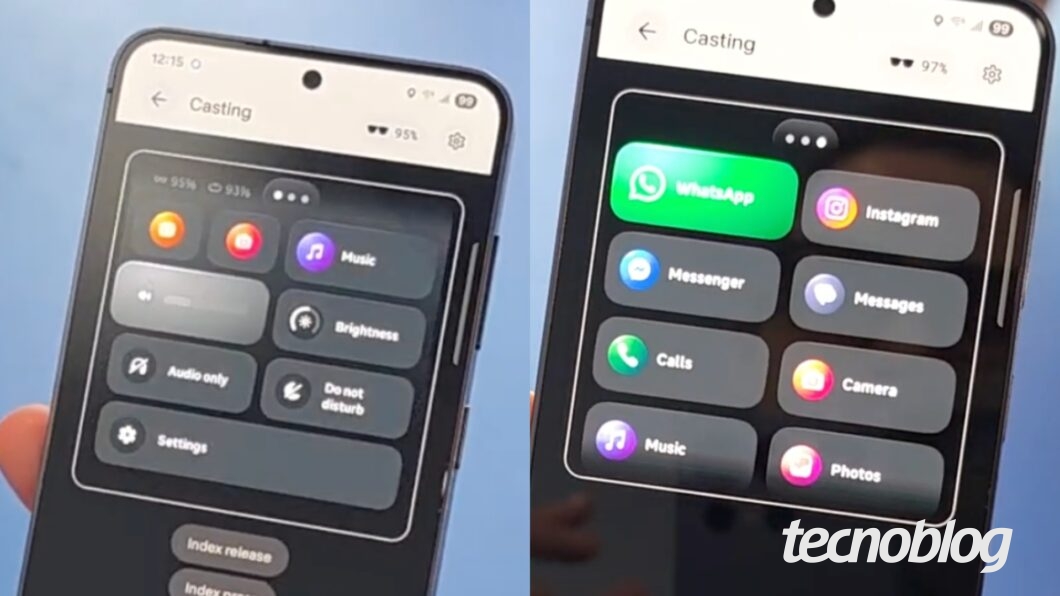 A tela inicial traz uma série de aplicativos, como Música, Mapas, Instagram e WhatsApp, além da câmera. Também é possível utilizar comandos de voz, integrados ao Meta AI, o serviço de inteligência artificial da Meta. Aliás, o pareamento se dá por meio do app Meta AI.