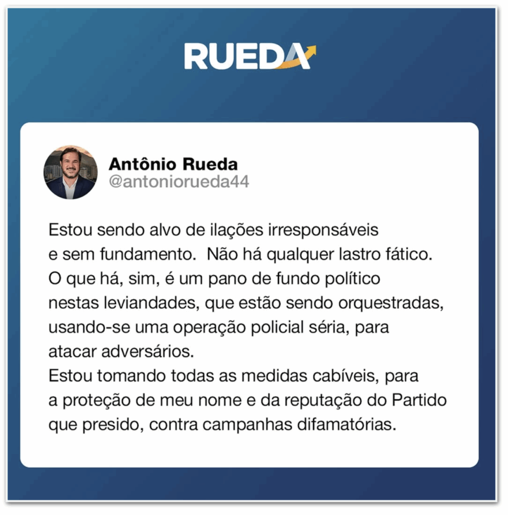 Em publicação nas redes sociais, Rueda disse estar sendo “alvo de ilações irresponsáveis e sem fundamento” e classificou a inclusão na Carbono Oculto como parte de “campanhas difamatórias”.