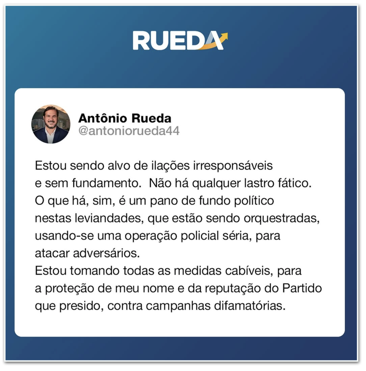 “O União Brasil, por meio de sua Executiva Nacional e de suas Lideranças na Câmara dos Deputados e no Senado Federal, manifesta irrestrita solidariedade ao Presidente Antonio Rueda, diante de notícias infundadas, prematuras e superficiais que tentam atingir a honra e a imagem do nosso principal dirigente.