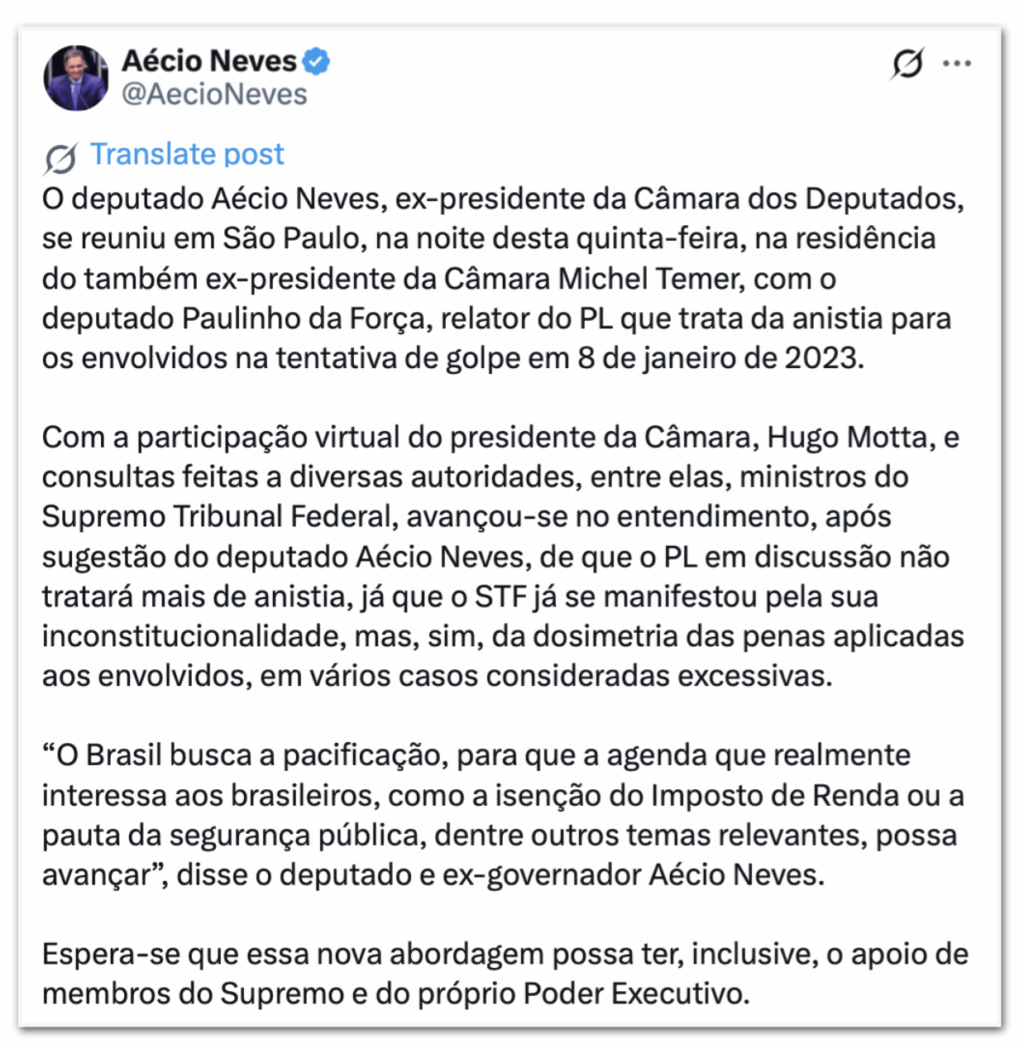 Em seu perfil no X, Aécio disse que a “pacificação” pode permitir ao Congresso debruçar-se sobre a agenda “que realmente interessa aos brasileiros, como a isenção do Imposto de Renda ou a pauta da segurança pública”.