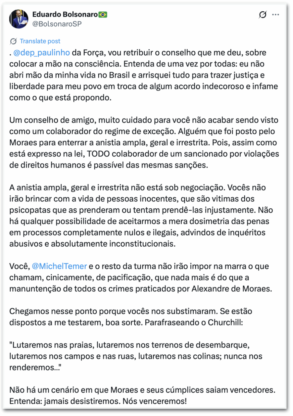 Em post no X, o parlamentar descartou qualquer negociação que não resulte em anistia “ampla, geral e irrestrita”. “Entenda de uma vez por todas: eu não abri mão da minha vida no Brasil e arrisquei tudo para trazer justiça e liberdade para meu povo em troca de algum acordo indecoroso e infame como o que está sendo proposto”, escreveu.