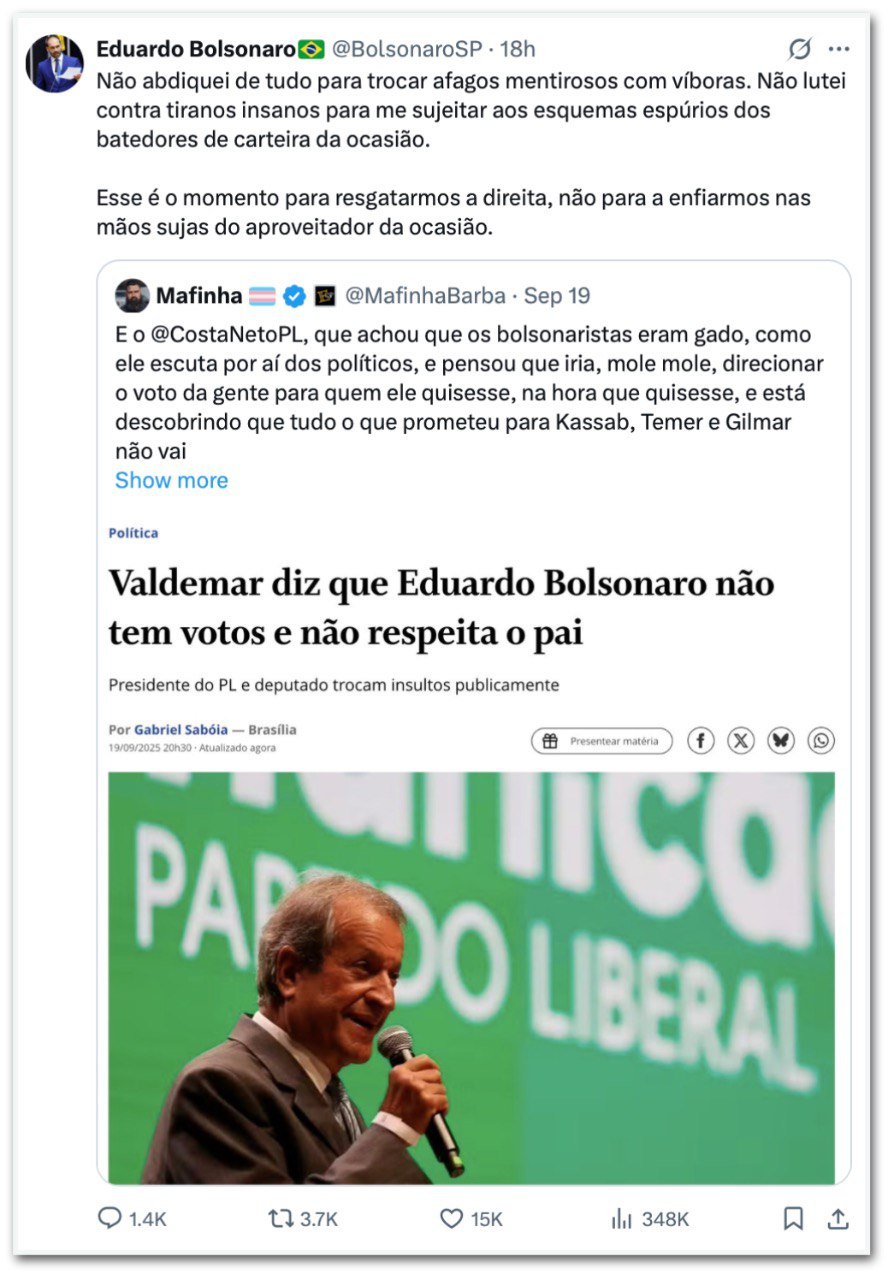 O deputado federal Eduardo Bolsonaro (PL-SP) afirmou no sábado (20.set.2025) que “esse é o momento para resgatarmos a direita, não para a enfiarmos nas mãos sujas do aproveitador da ocasião”. A declaração foi feita em seu perfil no X, ao compartilhar uma publicação crítica ao presidente do PL, Valdemar Costa Neto.