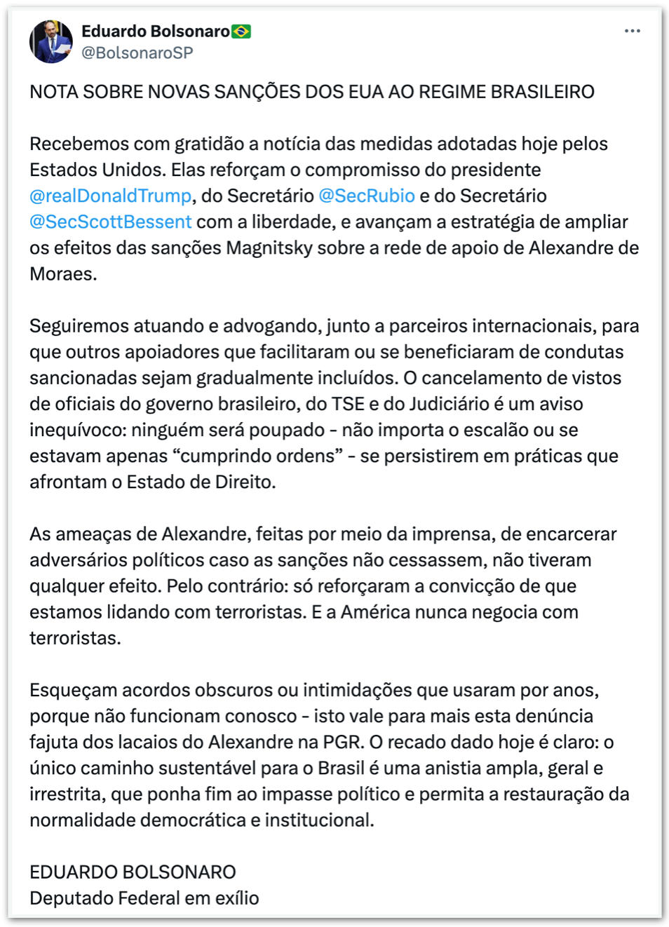 Eis o post de Eduardo, que atua nos EUA desde fevereiro por sanções contra autoridades brasileiras a fim de obter anistia para o pai, o ex-presidente Jair Bolsonaro (PL), condenado por tentativa de golpe de Estado depois de perder as eleições de 2022 para Luiz Inácio Lula da Silva (PT):