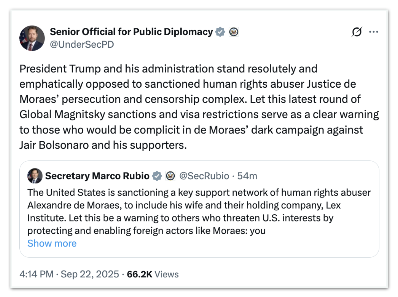 “O presidente Trump e sua administração se posicionam de forma resoluta e enfática contra o complexo de perseguição e censura do violador de direitos humanos sancionado, o juiz de Moraes. Que esta nova rodada de sanções do Global Magnitsky e restrições de visto sirva como um alerta claro para aqueles que possam ser cúmplices da campanha sombria de Moraes contra Jair Bolsonaro e seus apoiadores”, escreveu o número 2 de Rubio.