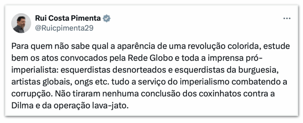 O presidente do partido, Rui Costa Pimenta, classificou os atos como uma “revolução colorida”. Ele escreveu no X: “Esquerdistas desnorteados e esquerdistas da burguesia, artistas globais, ONGs etc. tudo a serviço do imperialismo combatendo a corrupção”.