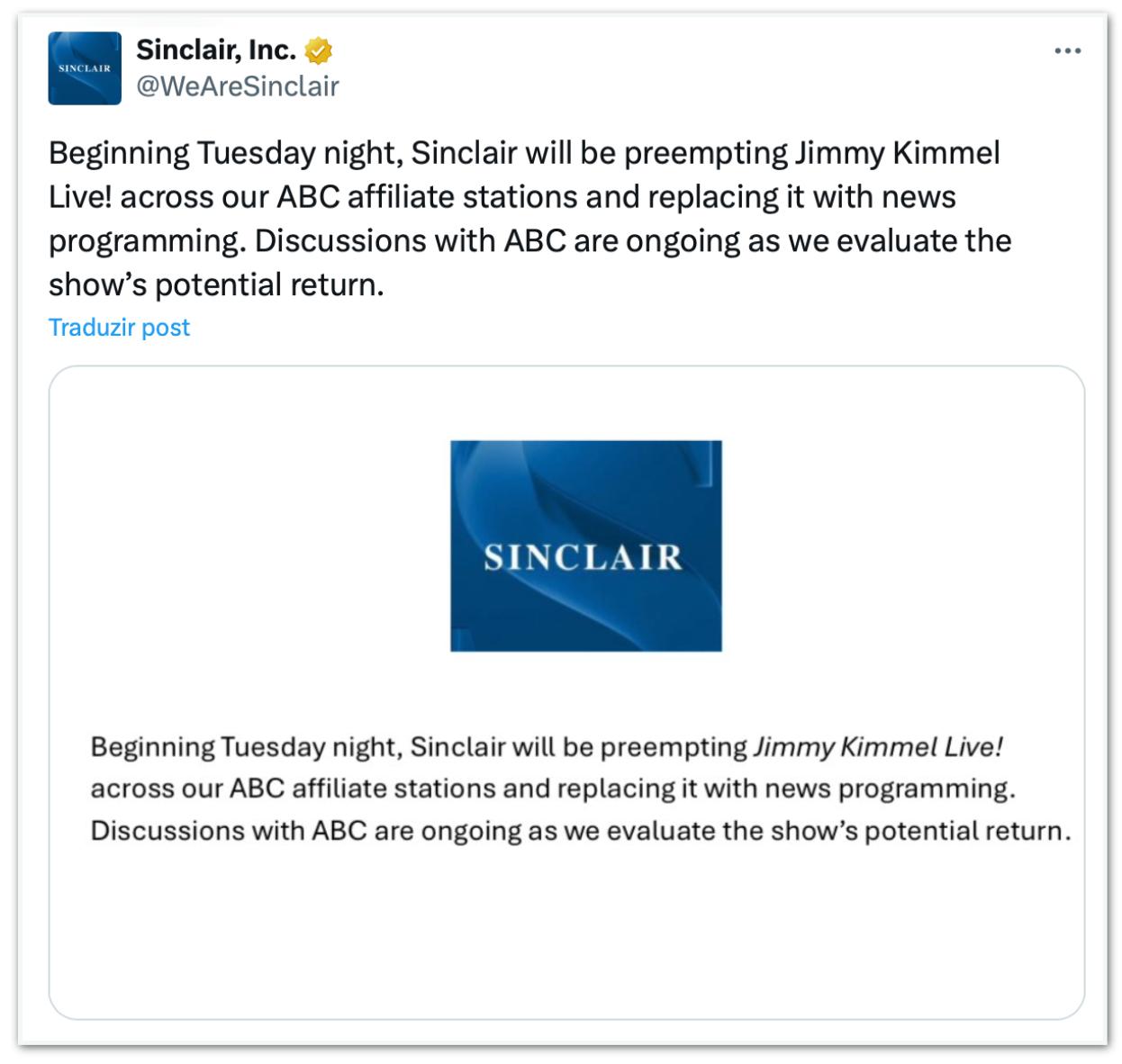 “A partir da noite de 3ª feira, a Sinclair interromperá o ‘Jimmy Kimmel Live!’ em nossas emissoras afiliadas da ‘ABC’ e o substituirá por programação jornalística. As discussões com a ‘ABC’ estão em andamento enquanto avaliamos o possível retorno do programa”, escreveu a empresa no X.
