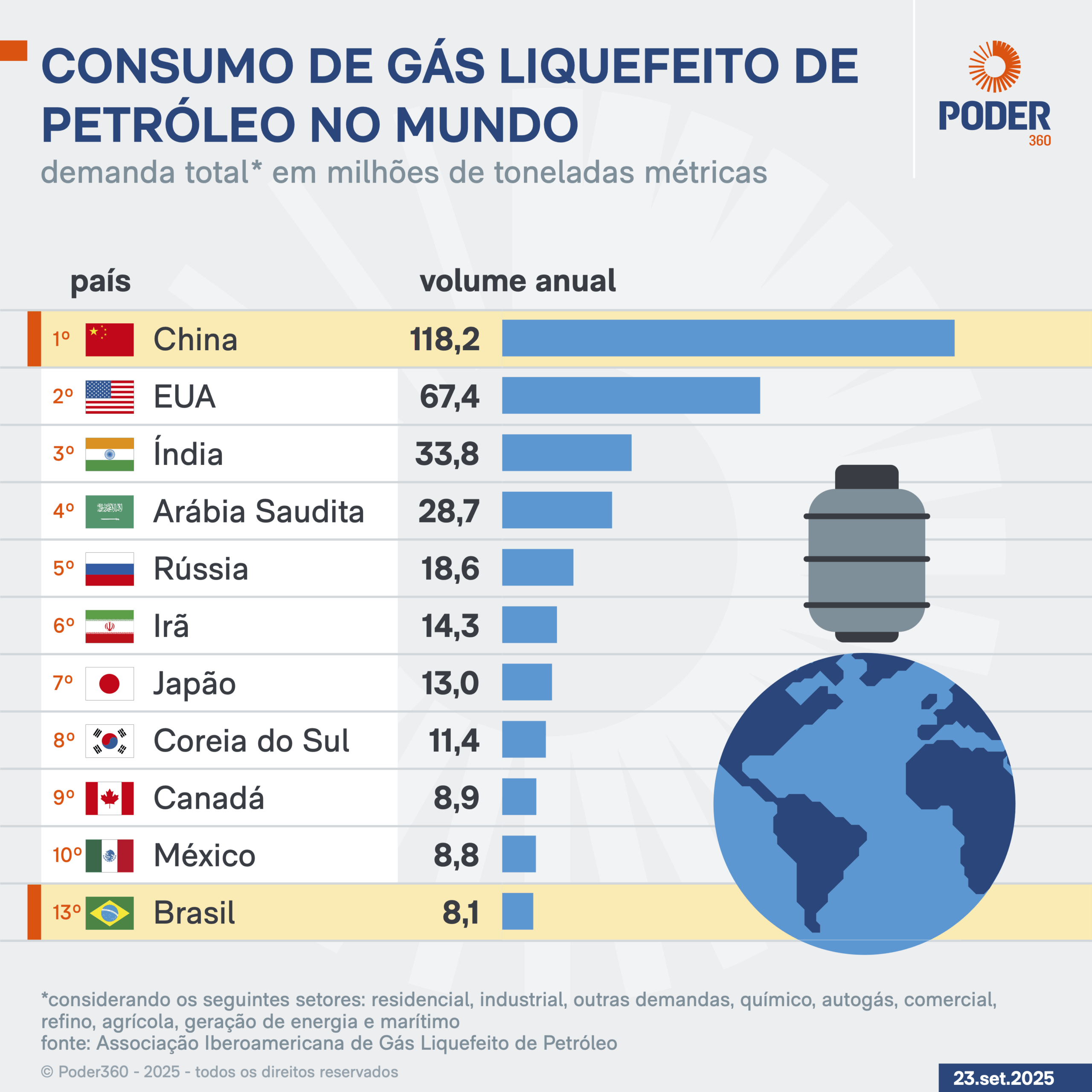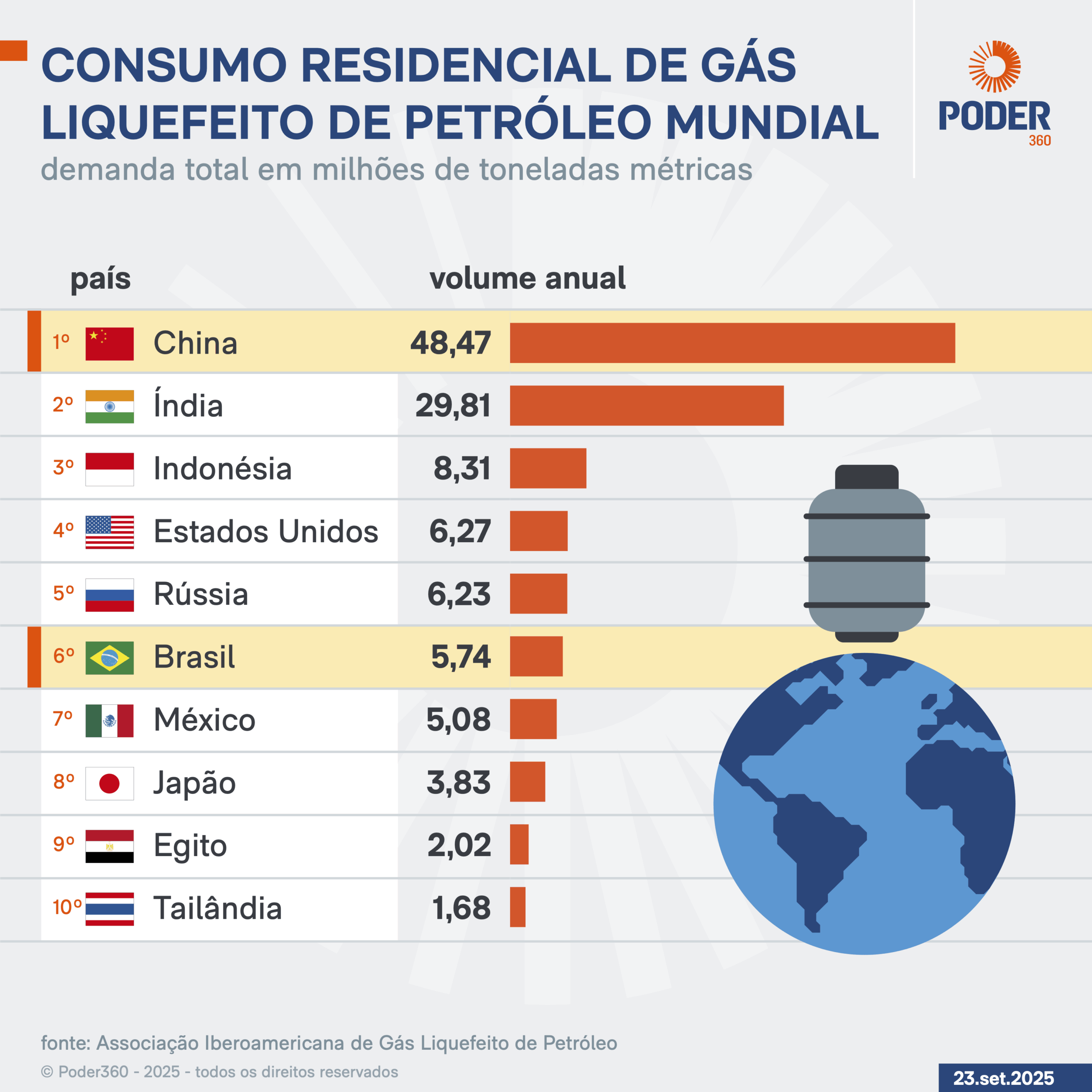 O GLP é um combustível limpo, eficiente e acessível, com impacto direto na qualidade de vida de bilhões de pessoas. No Brasil, 6º maior consumidor residencial do mundo, o gás é usado principalmente nos lares, com consumo per capita anual de quase 34 kg.