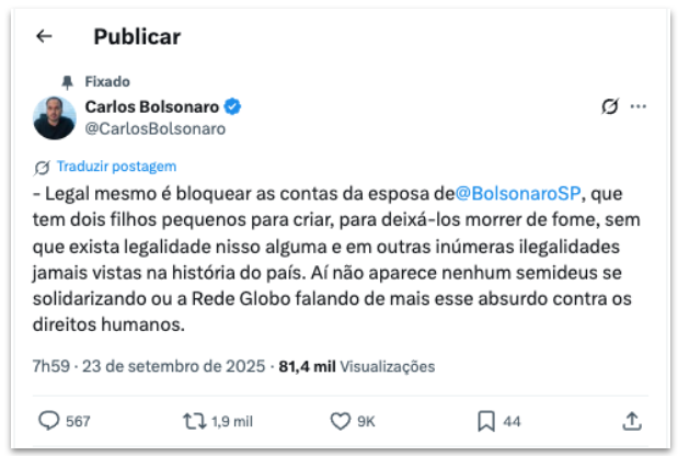 “Legal mesmo é bloquear as contas da esposa de @BolsonaroSP, que tem dois filhos pequenos para criar, para deixá-los morrer de fome, sem que exista legalidade alguma nisso”, afirmou o Carlos em post na plataforma X. “Aí não aparece nenhum semideus se solidarizando ou a Rede Globo falando de mais esse absurdo contra os direitos humanos.”