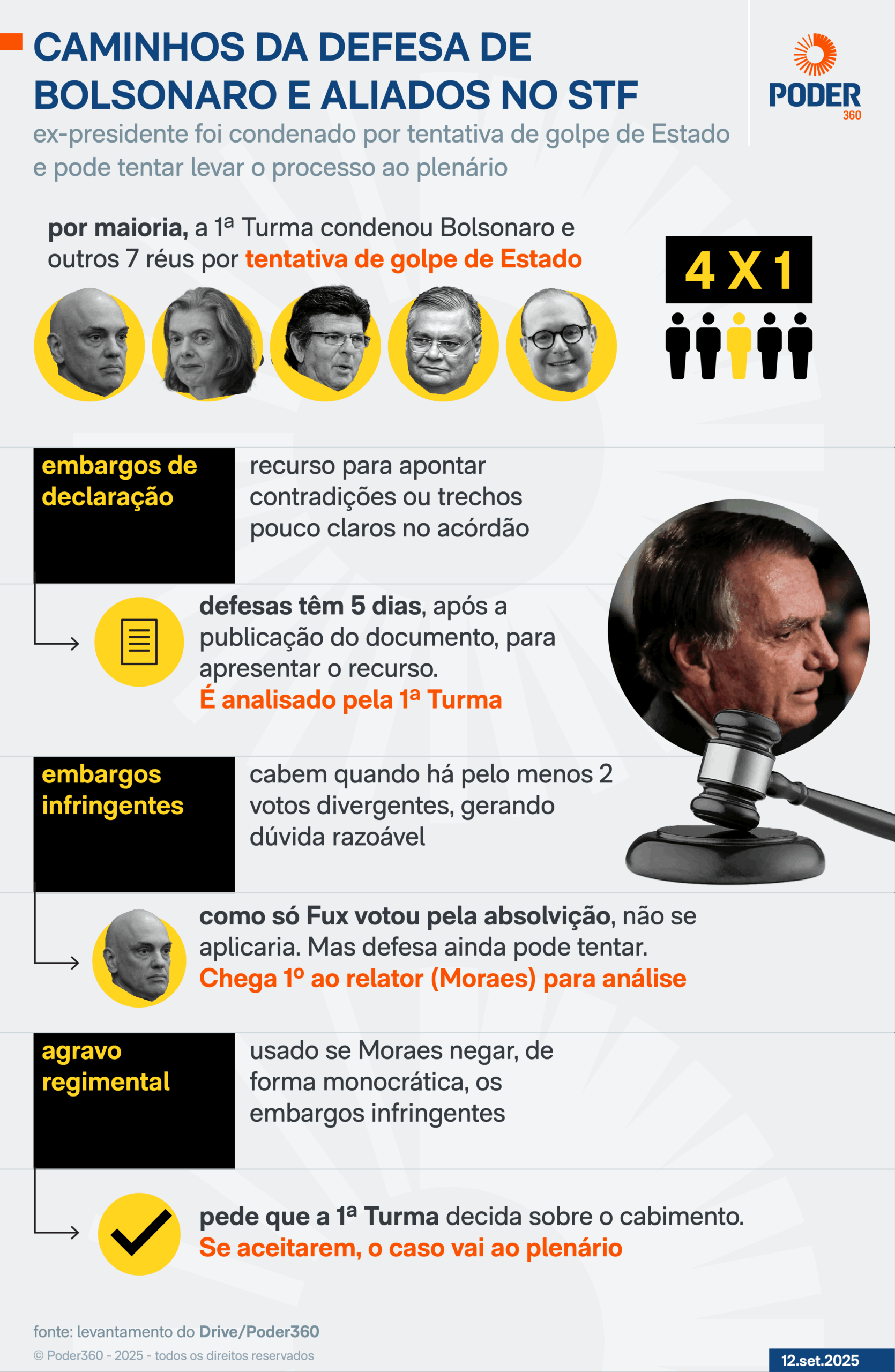 Bolsonaro foi condenado por maioria, em 11 de setembro, a 27 anos e 3 meses de prisão. A defesa já afirmou que pretende recorrer. Ao Poder360, advogados de réus do chamado “núcleo 1” avaliam que o voto divergente do ministro Luiz Fux pode abrir margem para a interposição de embargos infringentes —recurso que, em tese, poderia levar o caso ao plenário do Supremo, composto por 11 ministros.