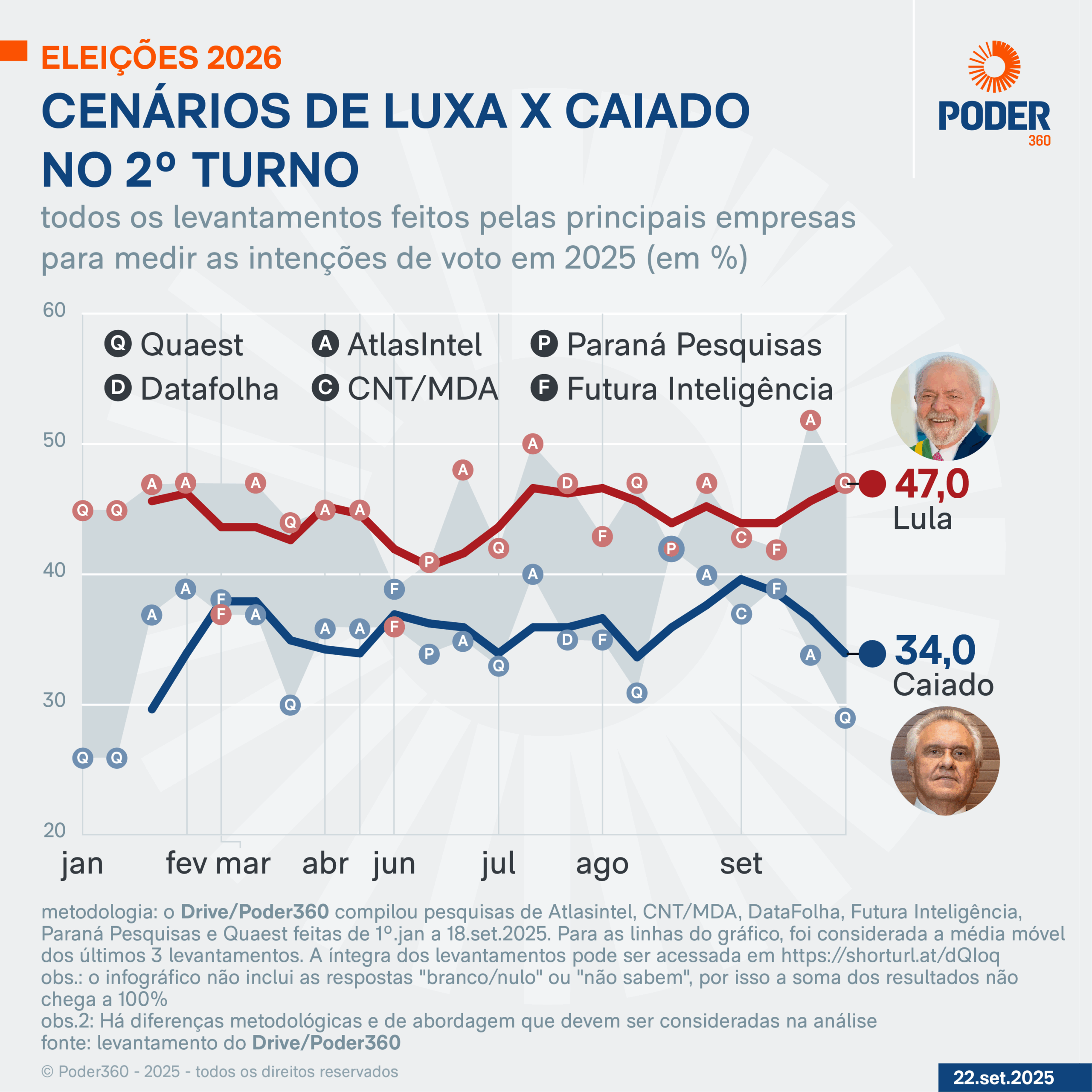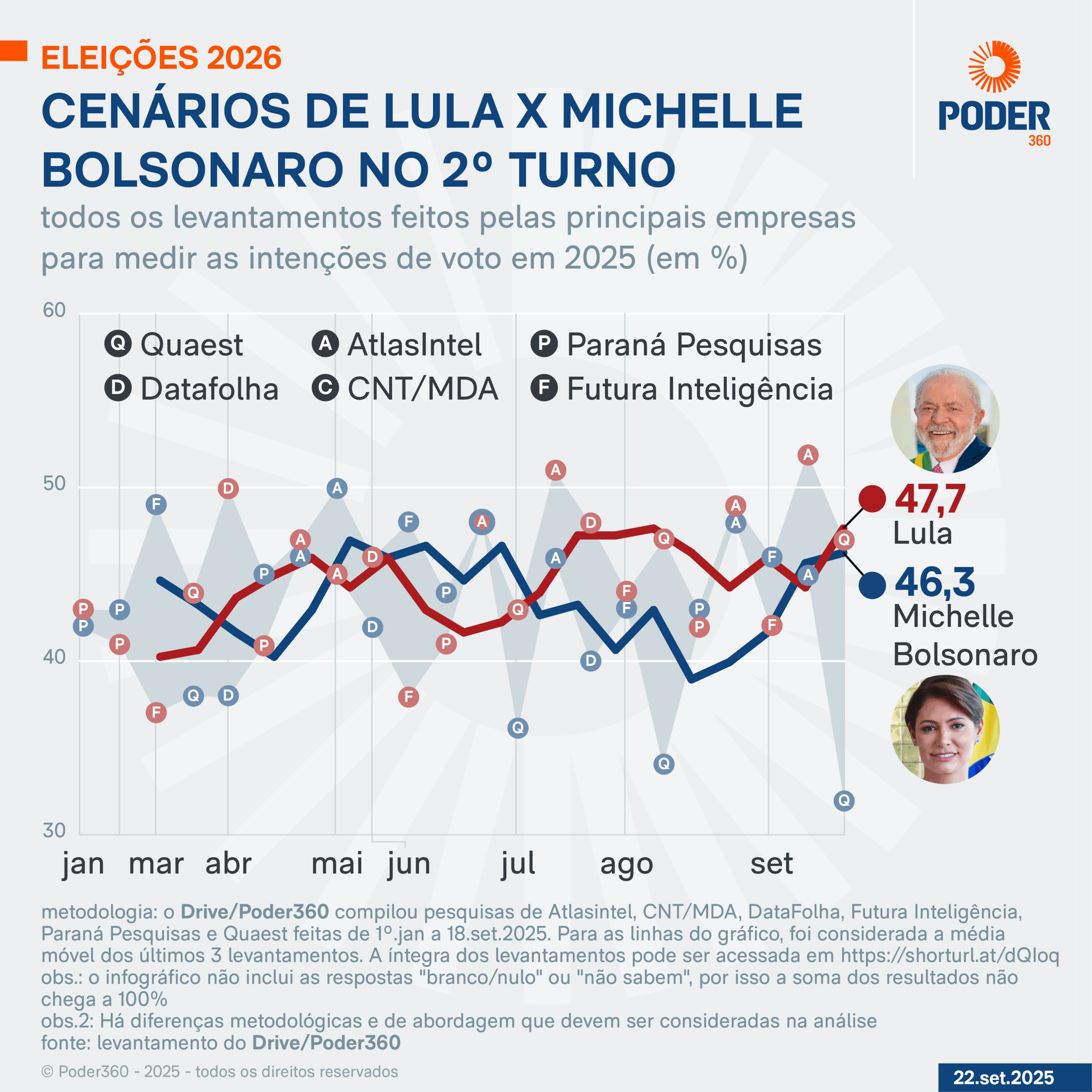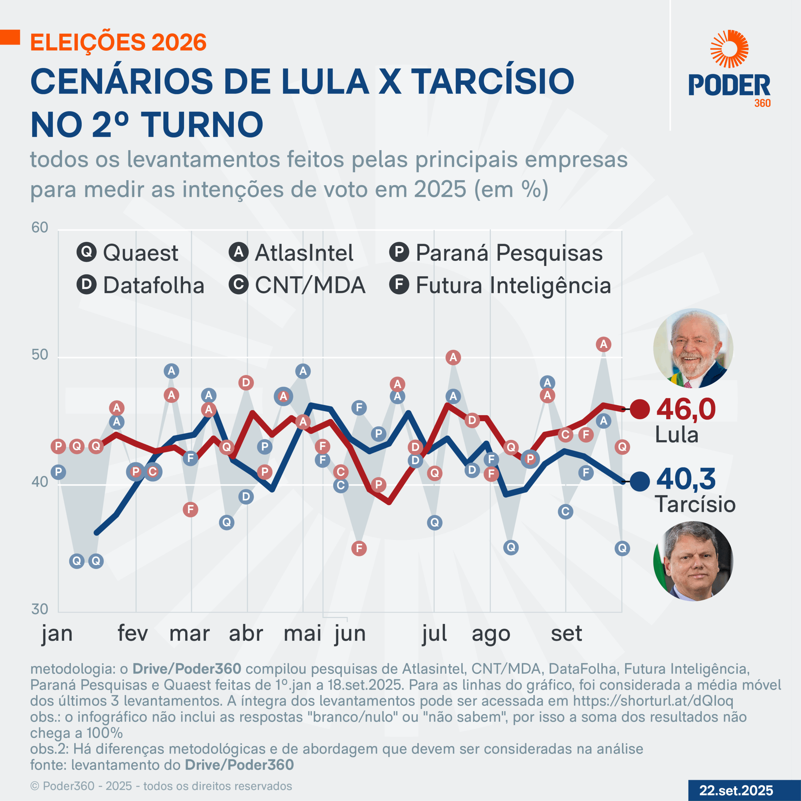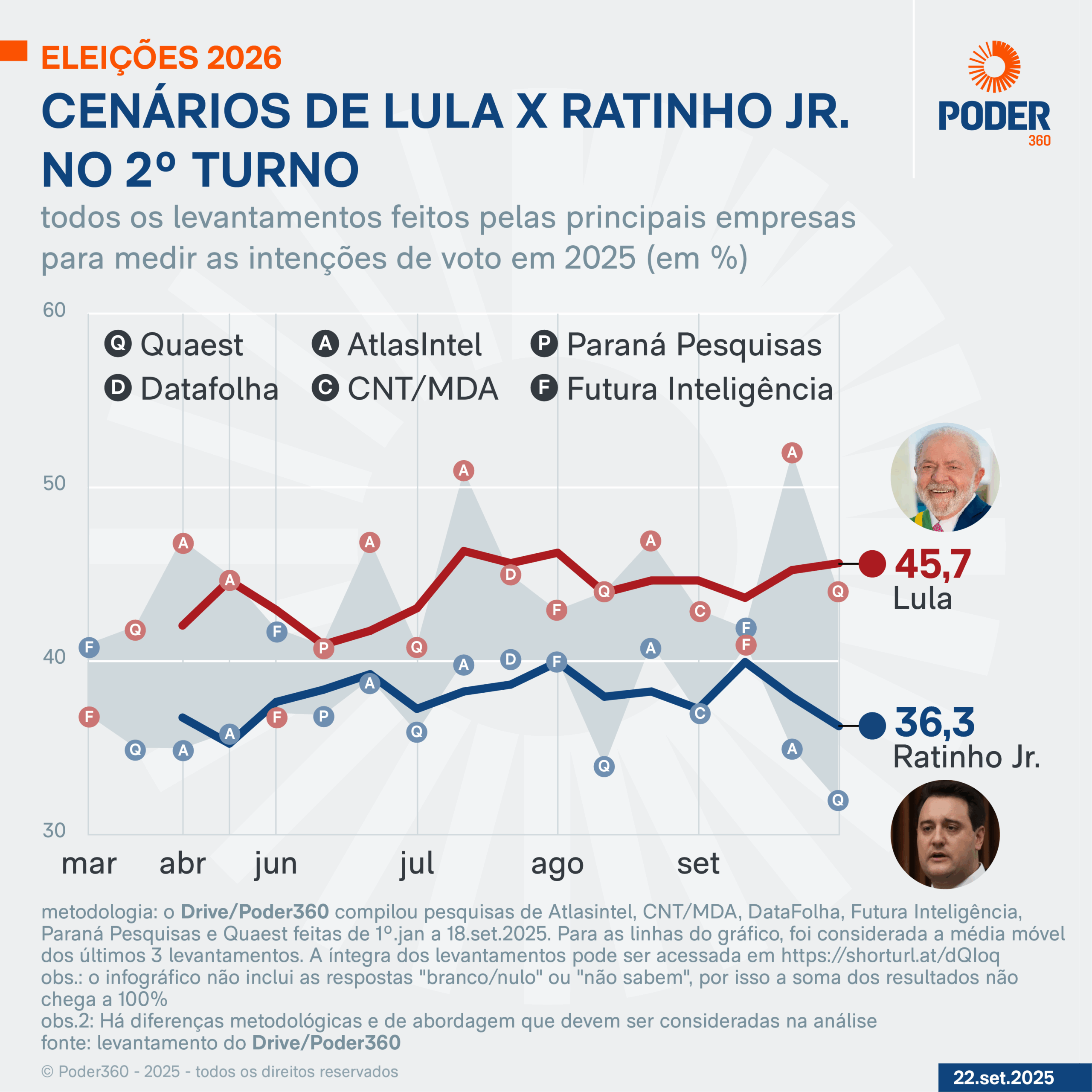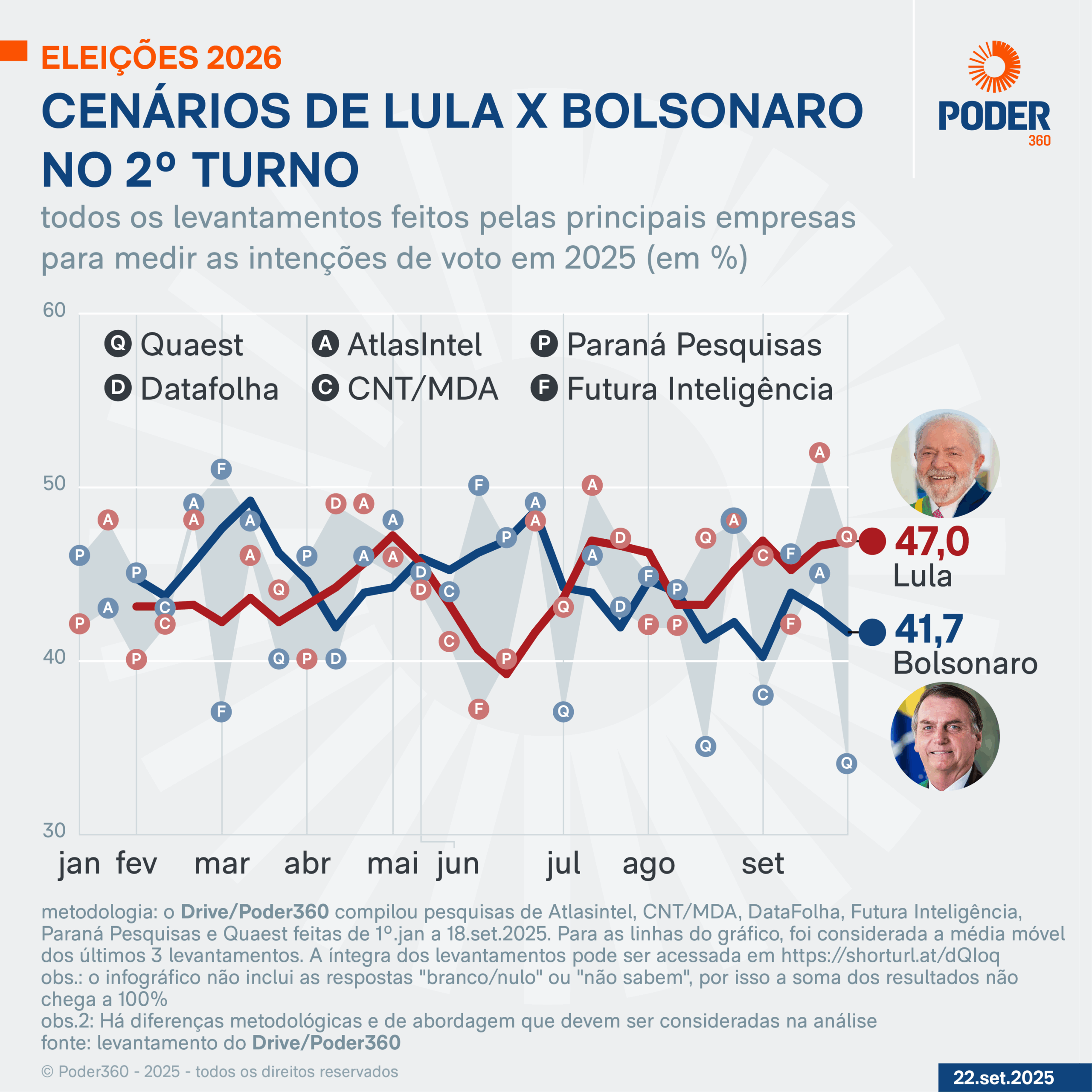 O Poder360 compilou os resultados das pesquisas feitas de 1º de janeiro a 18 de setembro de 2025 pelas empresas AtlasIntel, CNT/MDA, DataFolha, Futura Inteligência, Paraná Pesquisas e Quaest.