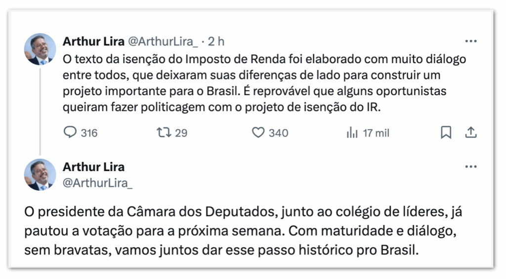 “O presidente da Câmara dos Deputados [Hugo Motta, Republicanos-PB], junto ao colégio de líderes, já pautou a votação para a próxima semana. Com maturidade e diálogo, sem bravatas, vamos juntos dar esse passo histórico para o Brasil”, escreveu Lira em seu perfil no X.