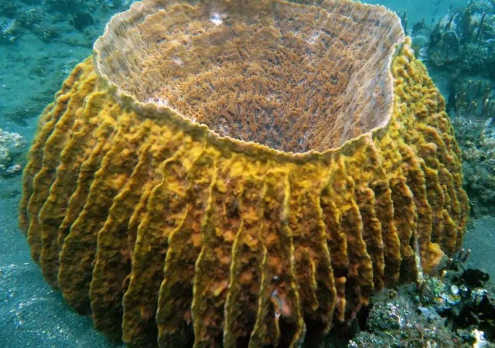 A esponja-barril (Xestospongia testudinaria), assim chamada devido ao seu formato cilíndrico, vive em mares tropicais como os das Filipinas e da Indonésia. Sabe-se que os espécimes viveram por mais de 2.000 anos e são semelhantes em tamanho a uma grande árvore, o que lhe rendeu o apelido de “sequoia do recife“.