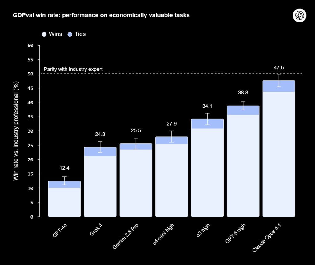 A empresa divulgou resultados do GDPval, um benchmark criado para medir a capacidade de modelos generativos em nove indústrias e 44 profissões, incluindo engenharia de software, advocacia, enfermagem, jornalismo, gestão de projetos e sistemas de informação.