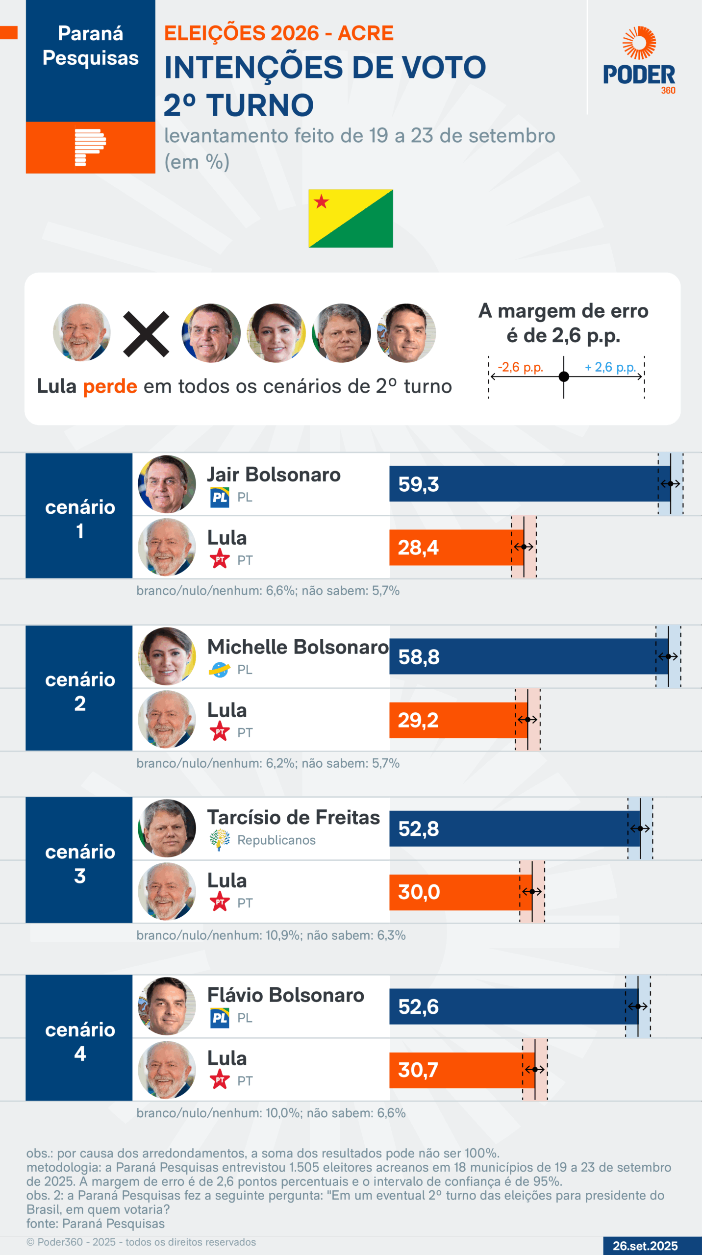 A Paraná Pesquisas entrevistou 1.505 eleitores acreanos em 18 municípios de 19 a 23 de setembro de 2025. A margem de erro é de 2,6 pontos percentuais e o intervalo de confiança é de 95%.